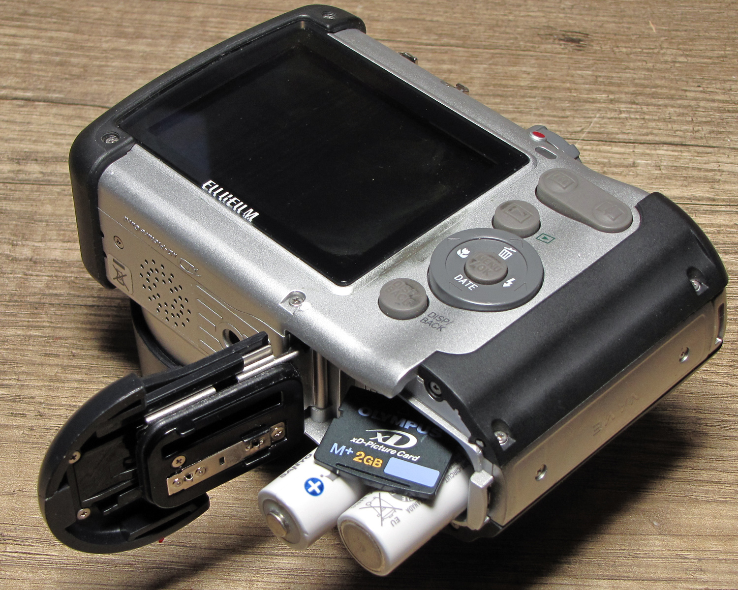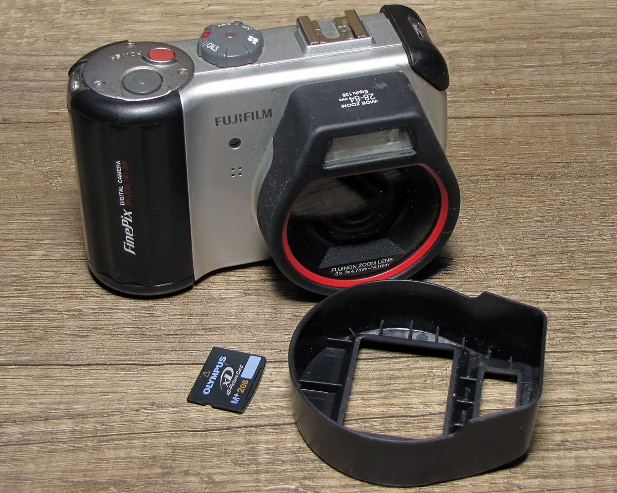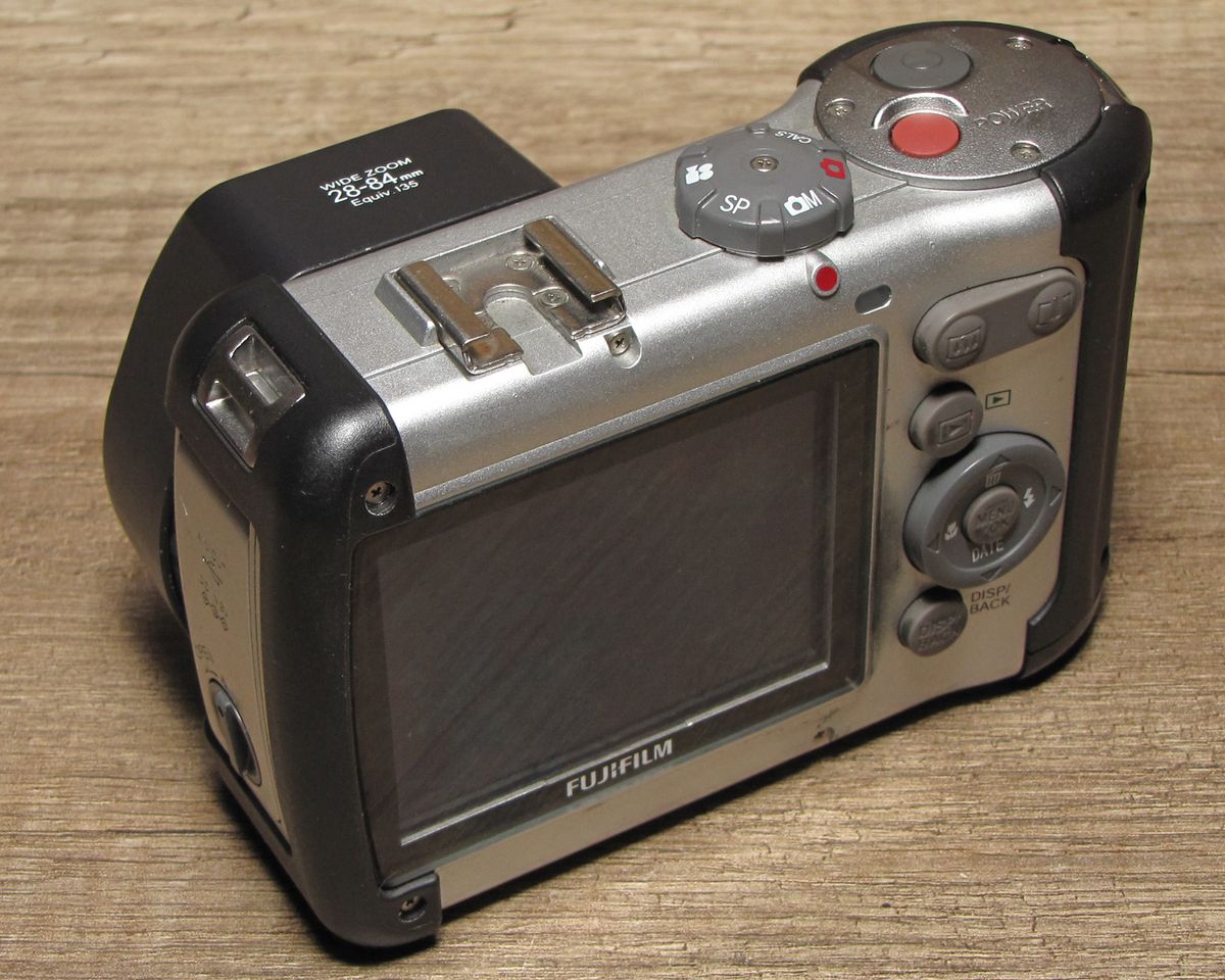 Der Gehäuseblitz mit TTL-Vorblitztechnik ist fest eingebaut. Zusätzlich ist ein Norm-Blitzschuh (ohne elektrische Kontakte) vorhanden. Im Kameramenu wird ein externer Zusatzblitz erwähnt, vermutlich gab es einen drahtlos durch den internen Blitz mitgezündeten Aufsteckblitz von Fuji. Meine erste Vermutung war, daß ggf. im Kamerainneren eine Art magnetische Zündung eingebaut ist, aber um den Blitzschuh herum ist im Gehäuse nichts eingebaut. Dort, wo normalerweise der Zündkontakt im Blitzschuh angebracht ist, gibt es nur eine große Aussparung, damit aufgesteckte Fremdblitze keinesfalls elektrischen Kontakt bekommen.