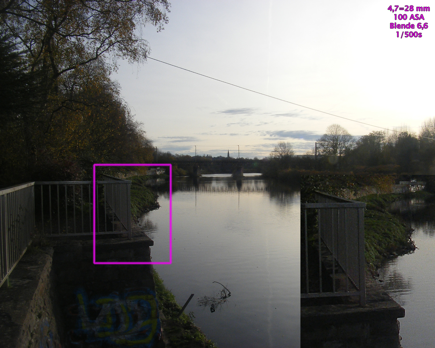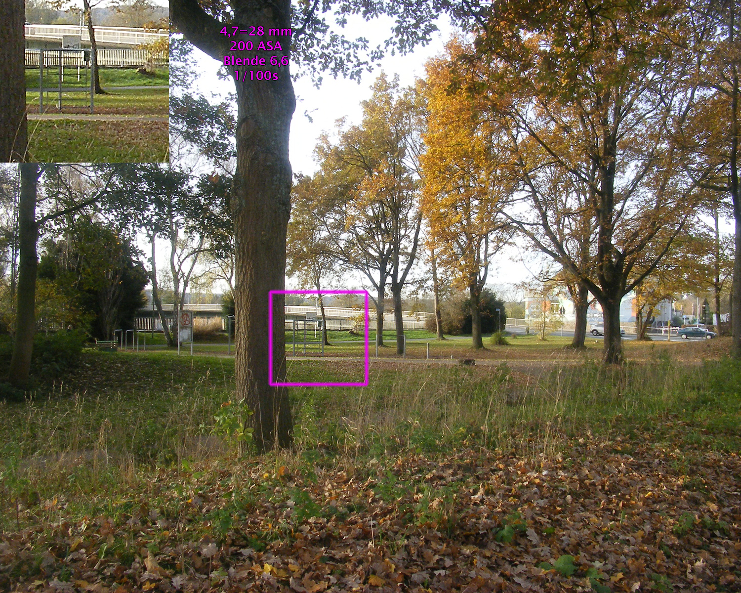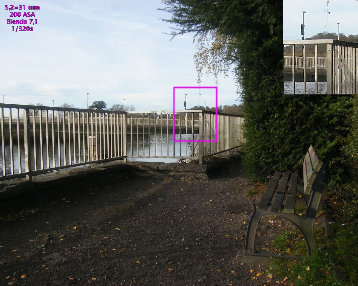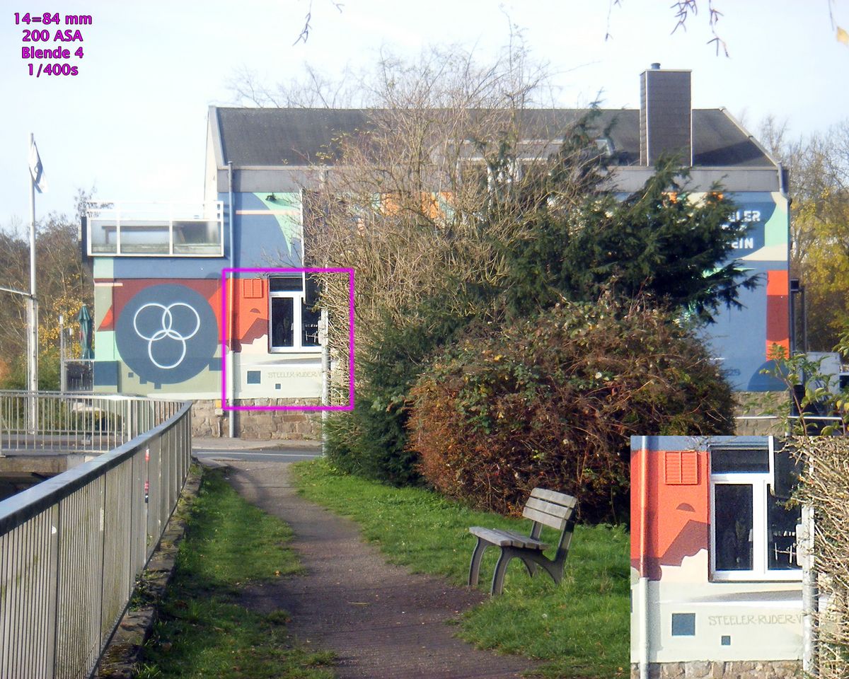 Alle Beispielaufnahmen entstanden bei 100 bis 200 ASA, gespeichert als JPG und bearbeitet mit Photoshop CS4. Bildausschnitt, Helligkeit, Farben, Lichter / Schatten sowie Schärfe wurden nicht korrigiert, die Größe wurde auf 1500 Pixel bikubisch verkleinert. In alle Aufnahmen sind 100%-Ausschnitte vergrößert einmontiert.