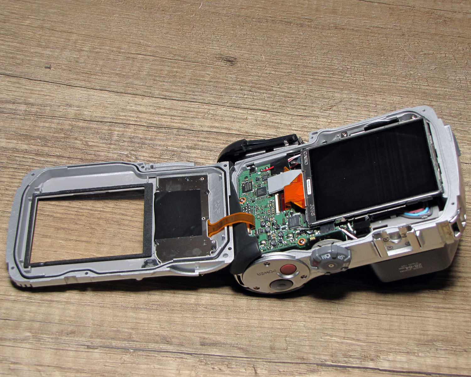 Die Kamera hatte einen Schaden am Display, leider ist Öl in das Display gelangt. Da die Streuscheibe der Hintergrund-Beleuchtung durch das Öl stark fleckig wurde, habe ich die Kamera geöffnet und versucht, auch die Display-Einheit zu zerlegen. Das war aber nicht möglich, da sie verklebt und mit feinsten Blech-Klammern verschlossen ist. Die gesamte Display-Einheit wurde übrigens von Casio hergestellt.