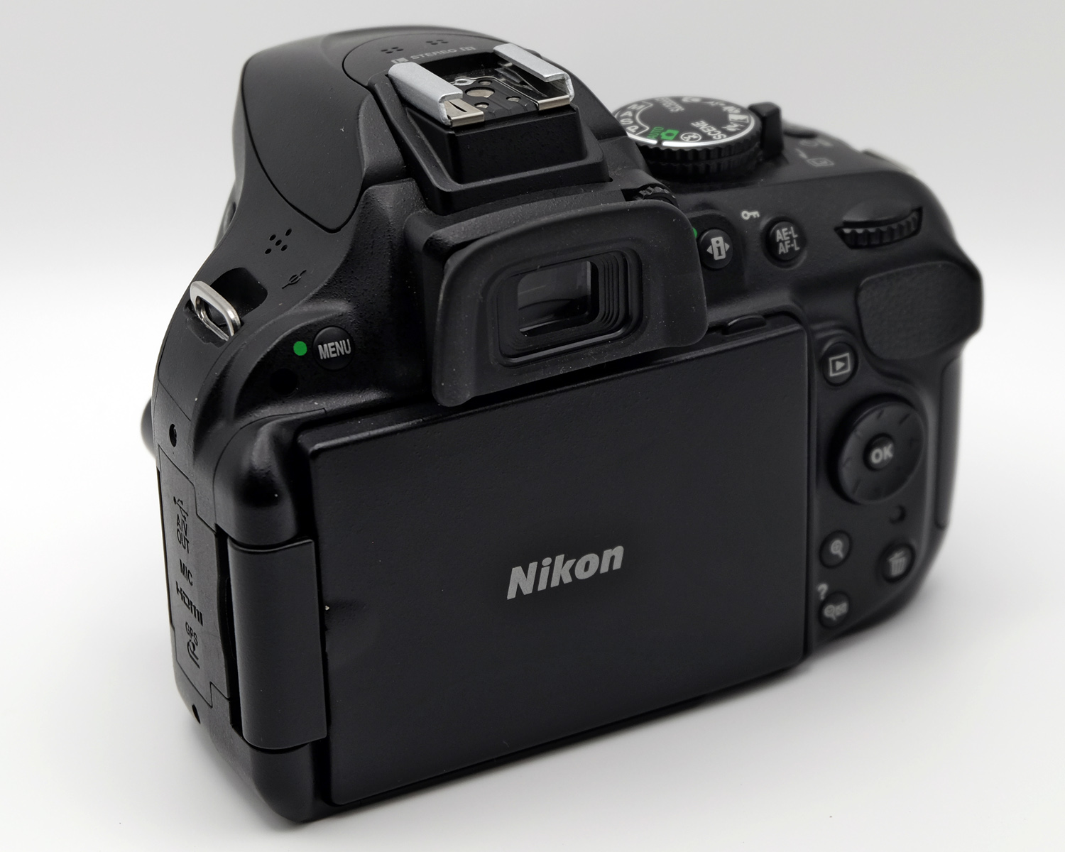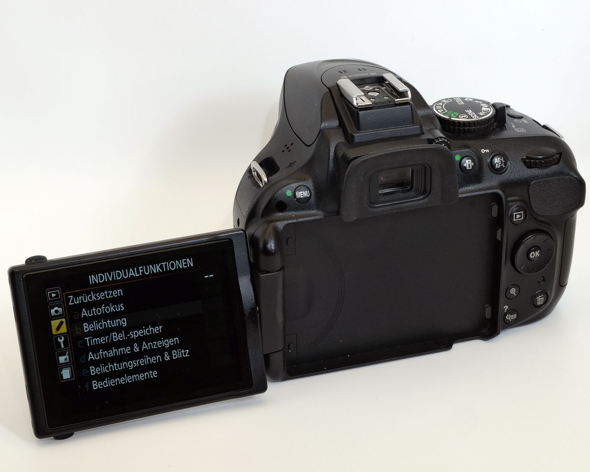 Die Tasten, die bei der D5000 links neben dem Display saßen, mußten dem seitlichem Klappmechanismus weichen. Sie wurden auf der Kamerarückseite „verteilt“, teilweise an Stellen, wo man sie am wenigsten erwarten würde. Immerhin haben die Steuerkreuz-Tasten keine „Zweitfunktion“ wie bei vielen Kameras der Mitbewerber, die sie für „Blitzmodus“, „Display“, Selbstauslöser“ usw. verwenden. Sondern wie bei etlichen anderen Nikon-dSLRs dienen sie zum schnellen Verstellen des aktiven AF-Punktes, die mittlere Taste zum Aktivieren des zentralen Kreuz-AF-Sensors. Das geht wesentlich intuitiver als das Auswählen des AF-Feldes durch Drücken einer Taste und anschließendem Drehen des Daumen- oder Fingerrads, wie es z. B. bei Canon-Kameras üblich ist.