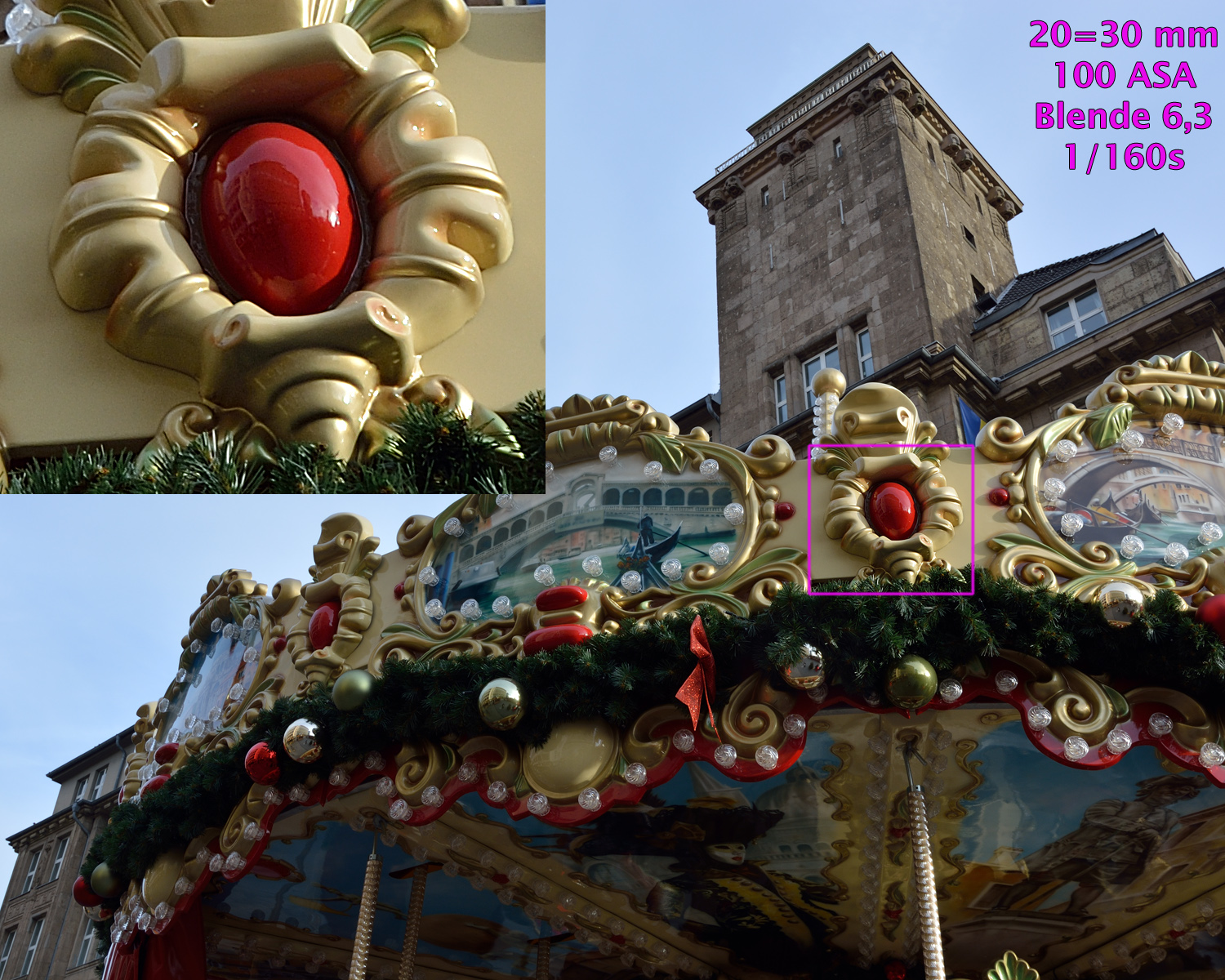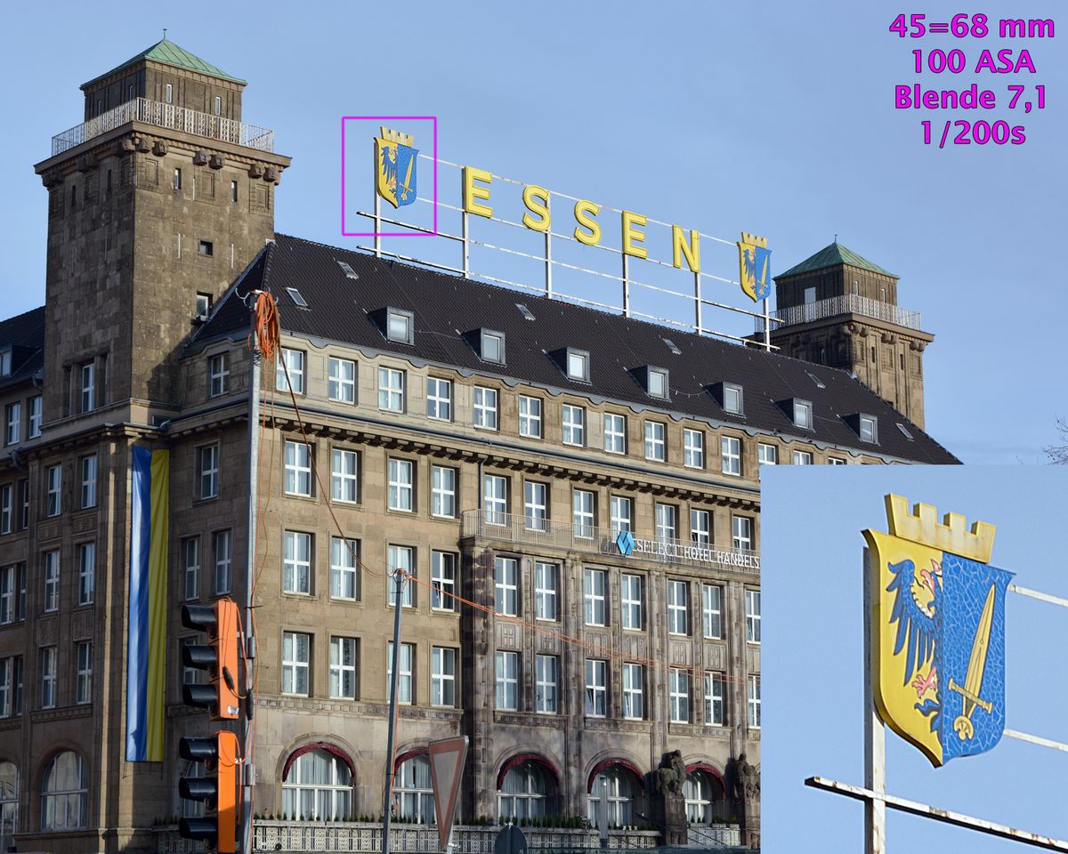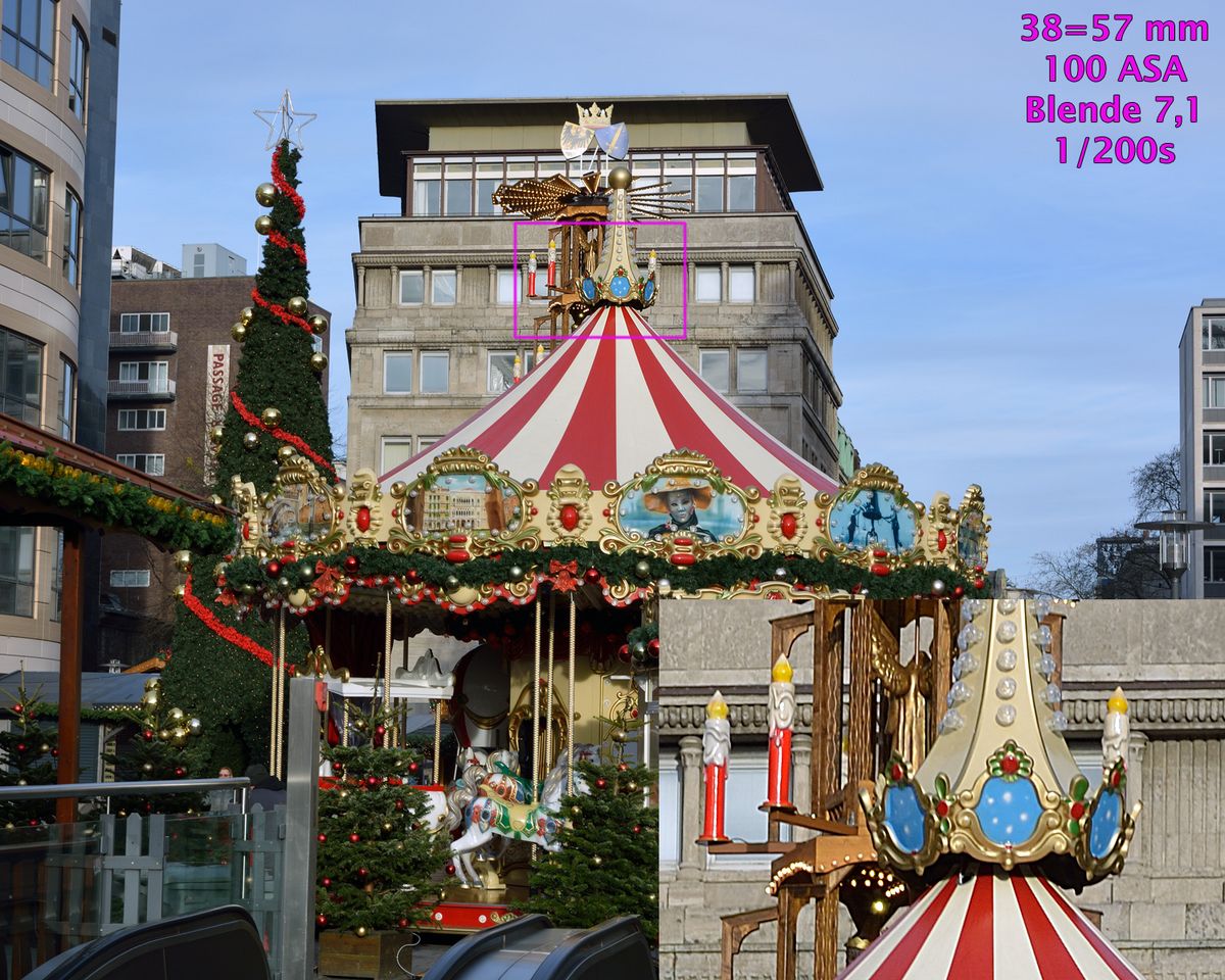 Alle Beispielaufnahmen entstanden bei ASA- und Programm-Automatik sowie dem 16-85 DX VR G, gespeichert als NEF, gewandet mit Nikon Capture, bearbeitet mit mit Photoshop CS4. Die Größe wurde auf 1500 Pixel bikubisch verkleinert. Schärfe, Verzeichnung, Vignettierung, Gradationskurve usw. wurde bearbeitet. 100% Bildausschnitte und die Aufnahmeparameter sind einmontiert.