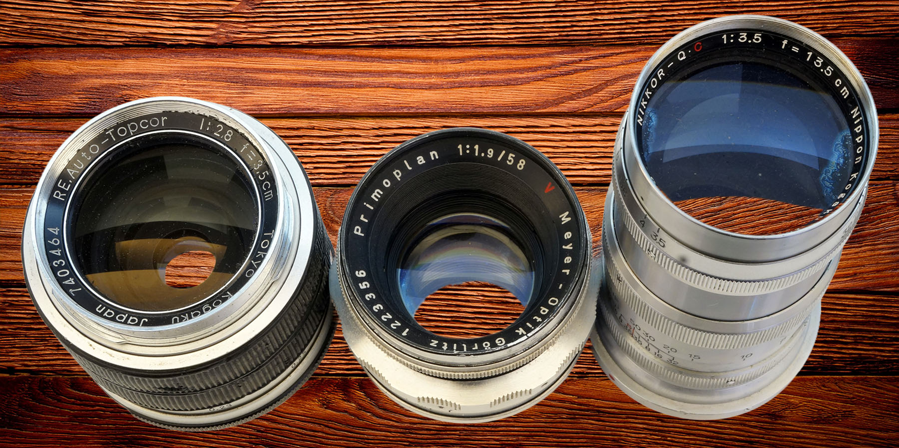 Das waren die drei Festbrennweiten, die jeder namhafte Hersteller im Programm hatte. Sogar heute noch, auch wenn Zoomobjektive diese Brennweiten vielfach vereinnahmt haben. Ob für die spiegellose (!) Analog-Messsucherkamera oder die Spiegelreflex. Das viele Jahre obligatorische 50 mm Normalobjektiv für bezahlbare Lichtstärke — hier abweichend als 58 mm Variante, das gemäßigte 35 mm Weitwinkel für "etwas mehr drauf", und das gegenüber dem Normalobjektiv 2,7-fach vergrößernde, aber noch trag-, handhab- und bezahlbare 135 mm. Von Ausreißern abgesehen, so gut wie immer mit mindestens guter Abbildungsqualität.