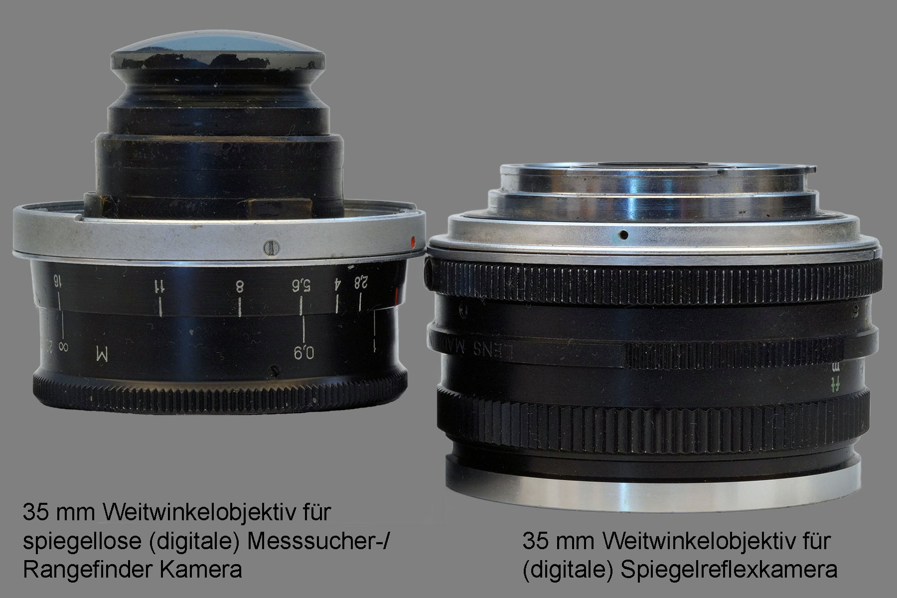 Zum Vergleich nochmal das Foto von oben mit dem 35 mm Weitwinkelobjektiv für eine spiegellose Messsucherkamera und daneben ein 35 mm Weitwinkel für die Spiegelreflexkamera. Leicht zu verstehen, dass das Rangefinder-Objektiv — die englische Bezeichnung für Messsucher — nicht auf die SLR montiert werden kann. Muss es auch heute nicht mehr, wozu gibt es erstklassige spiegellose Systemkameras und fertige Adapter!