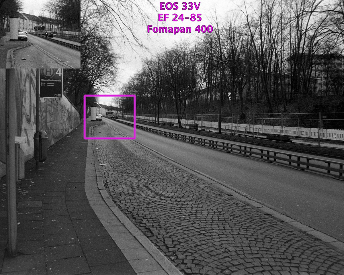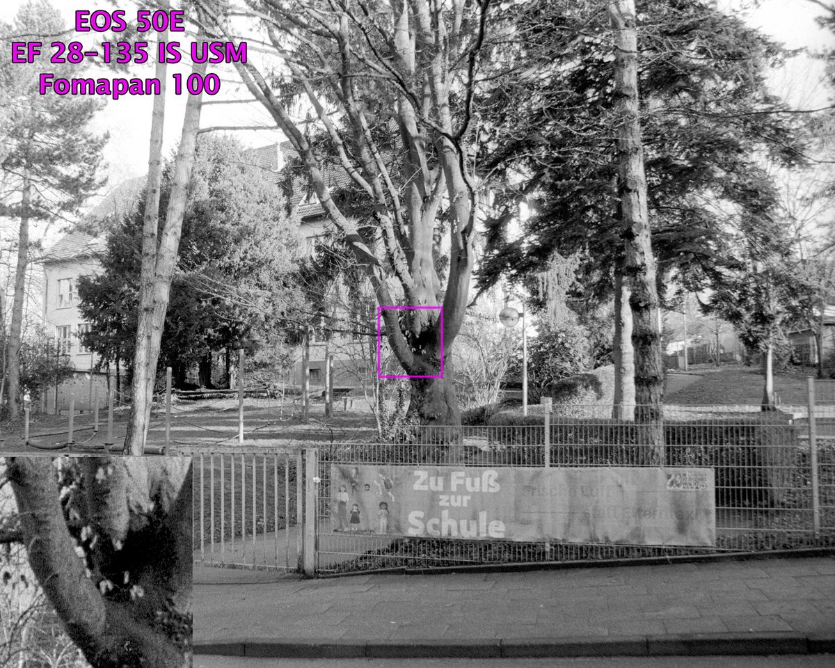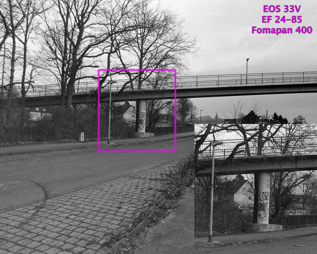 Trotzdem ist das 24-85 auch am mit ca. 6 Megapixel auflösendem 400-ASA-Film an den Ecken bei großen Blenden nicht wirklich scharf, das 28-135 überzeugt bei 100 ASA-Filmen und ca. 20 Megapixeln Scanauflösung in den Ecken nicht immer, würde den 400-ASA-Film jedoch ausreizen.