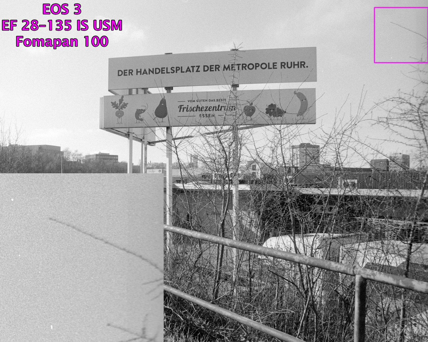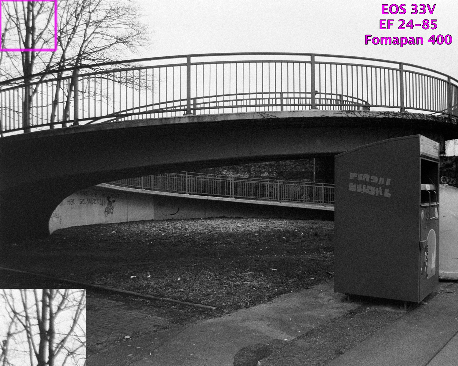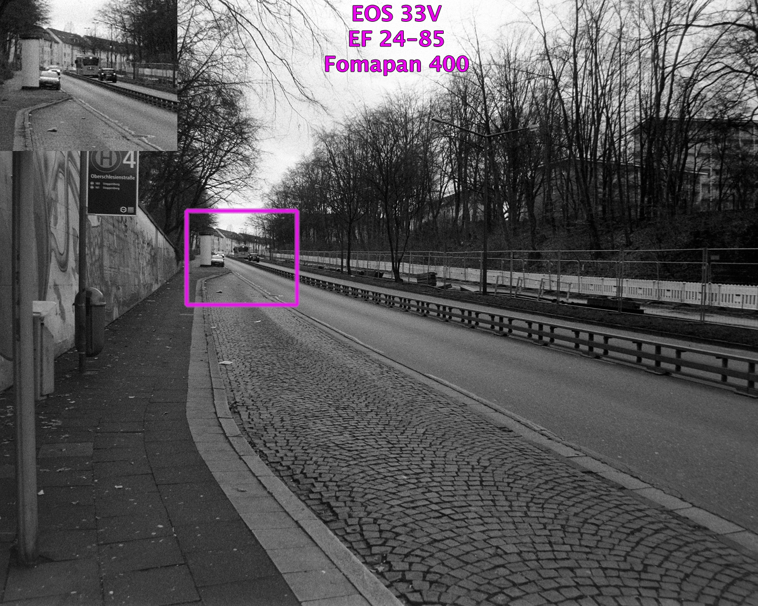 Alle Beispielaufnahmen entstanden freihand mit Programm-Automatik, wurden analog auf Fomapan „gespeichert“, entwickelt mit Tetenal Ultrafin Plus 1+4, digitalisiert mit Nikon Coolscan LS-50 ED / LS V ED und bearbeitet mit Photoshop CS4. Bildausschnitt, Helligkeit, Farben, Lichter / Schatten wurden korrigiert, die Größe wurde auf 1500 Pixel bikubisch verkleinert. In alle Aufnahmen sind die mir bekannten Aufnahmeparameter eingefügt, Brennweite, Blende und Belichtungszeit sind aufgrund der analogen Speicherung nicht bekannt gewesen.