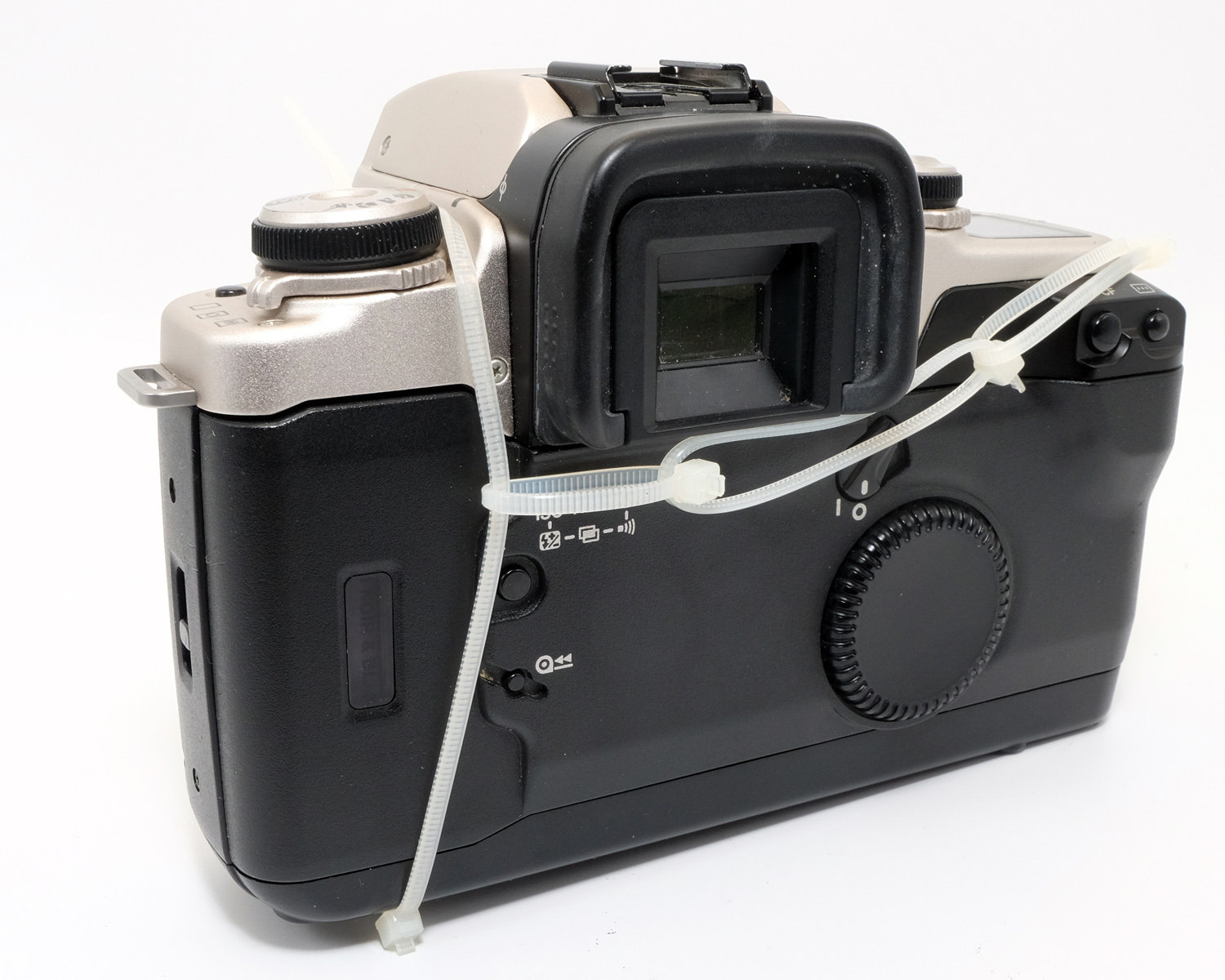 Es ist erforderlich, die Kamera-Rückwand zu entlasten, damit die Federkraft nicht von den Halteklammern aufgenommen werden muß. Bei der EOS 50E habe ich es mit Hilfe diverser Kabelbinder gemacht, weil die Kamera so rundlich gestaltet ist, daß eine ins Stativgewinde geschraubte Konstruktion auf die Schnelle nicht möglich war.