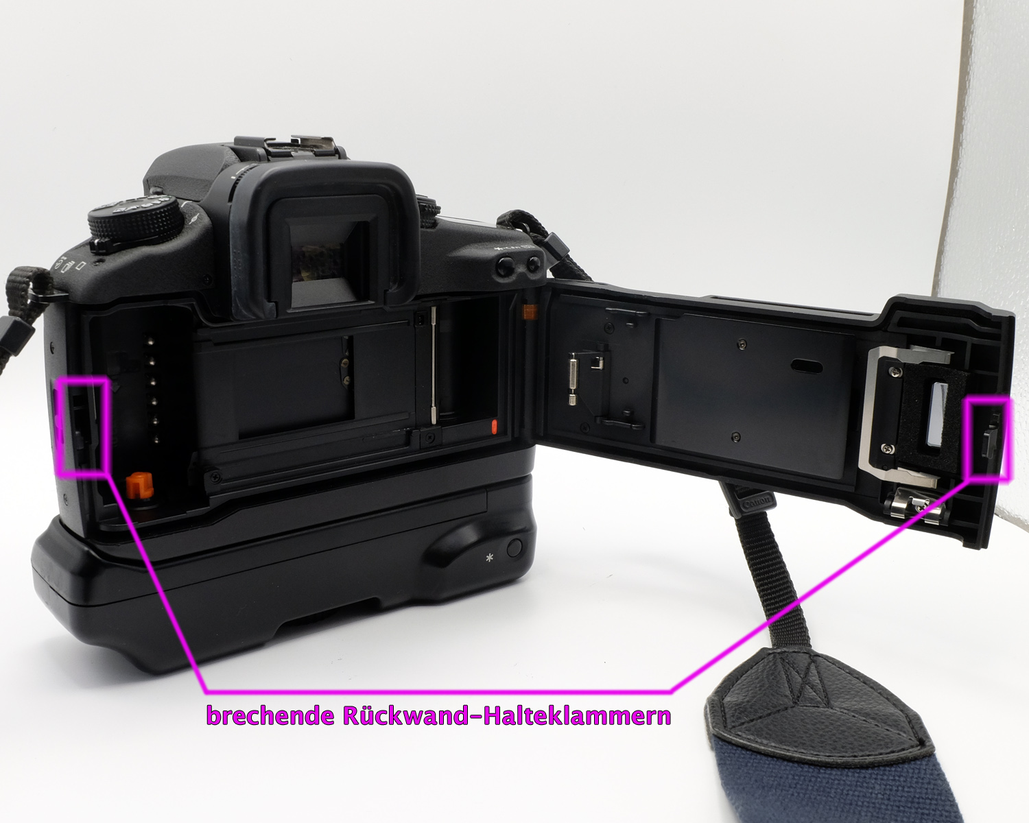 Die Binder von der Gurtöse ziehen den um die linke Seite gezogenen Binder so zur Seite, damit er nicht verrutschen kann und üben zusätzlich Druck auf die Rückwand aus. Da diese Konstruktion beim Fotoausflug unpraktisch ist, habe ich nur einen Film mit der EOS 50E belichtet und alle anderen mit der EOS 3 gemacht, deren Rückwand-Schließklammern aus Metall sind und darum nicht brechen können. Außerdem ist dieses Modell schneller und hat mehr AF-Sensoren, leider fehlt mir der Hochformatauslöser für Mignonzellen und dessen Nachkauf ist heutzutage sehr teuer geworden, denn er ist ein gesuchtes Teil, weil er auch an das Profimodell EOS 1V paßt. Aktuell kostet der Griff weit mehr als das Doppelte von meinem 2020 bezahltem Obolus für die Kamera, die inzwischen selber auch deutlich im Kurs gestiegen ist (das Analogrevival fordert Tribut).