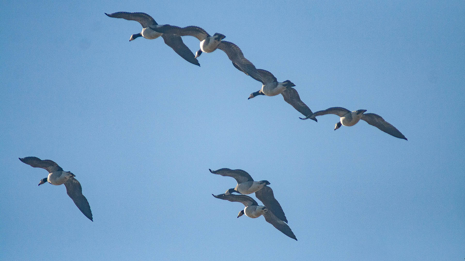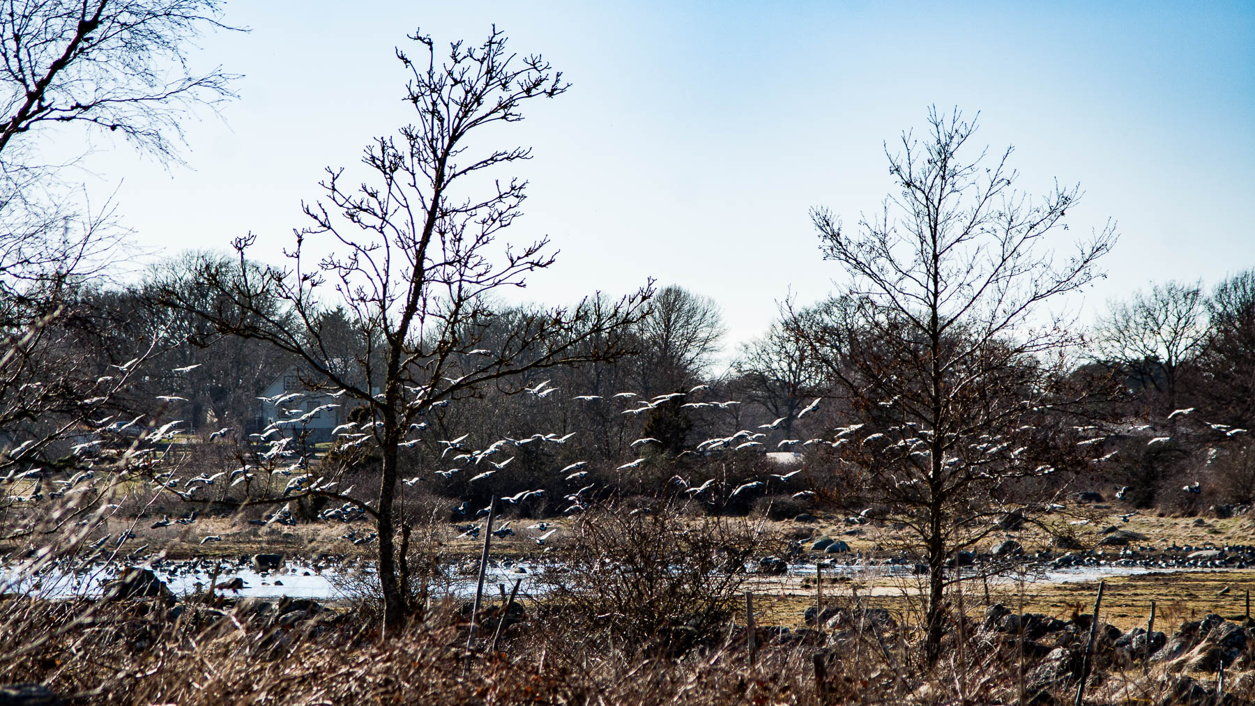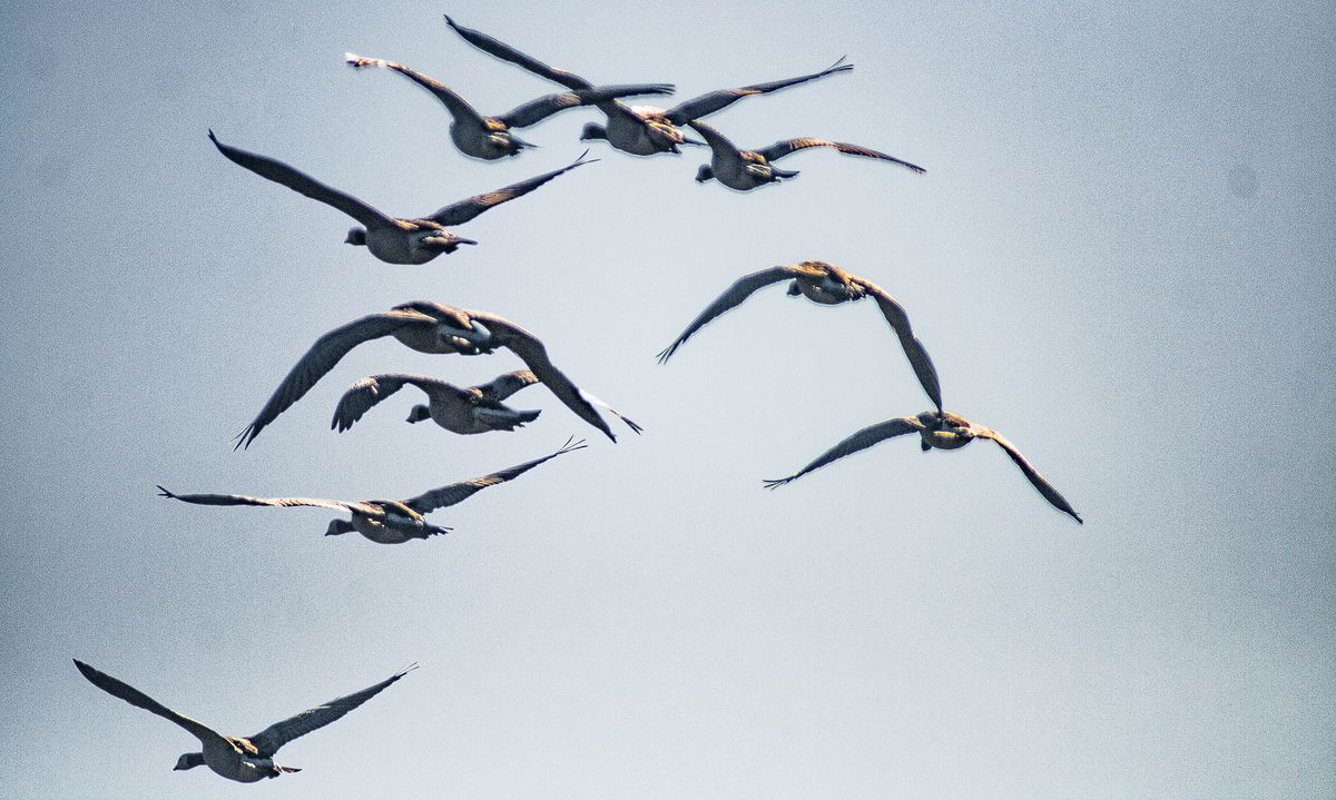 Die grasenden Gänse und die Gänse im Anflug sind aus je zwei Fotos zusammenmontiert …