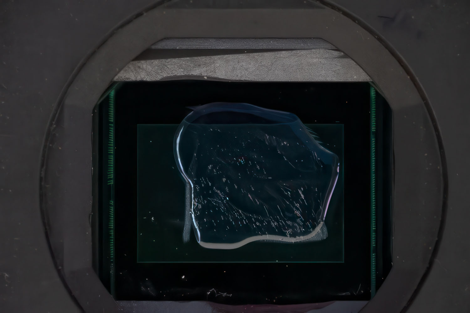 Ein winzige Verbesserung brachte aber das mit Aceton auf 1:4 bis 1:5 verdünnte istoyo UV RESIN (Harz). Und entscheidend: Nicht nur die Fehlstelle damit tropfenweise behandeln, sondern den ganzen Sensor! Gezeigt auf dem nebenstehenden Foto, bei dem man die Fehlstelle kaum noch erkennt. Dass die Schicht auf dem Sensor nicht eben zur Bildschärfe beiträgt, war eigentlich klar.