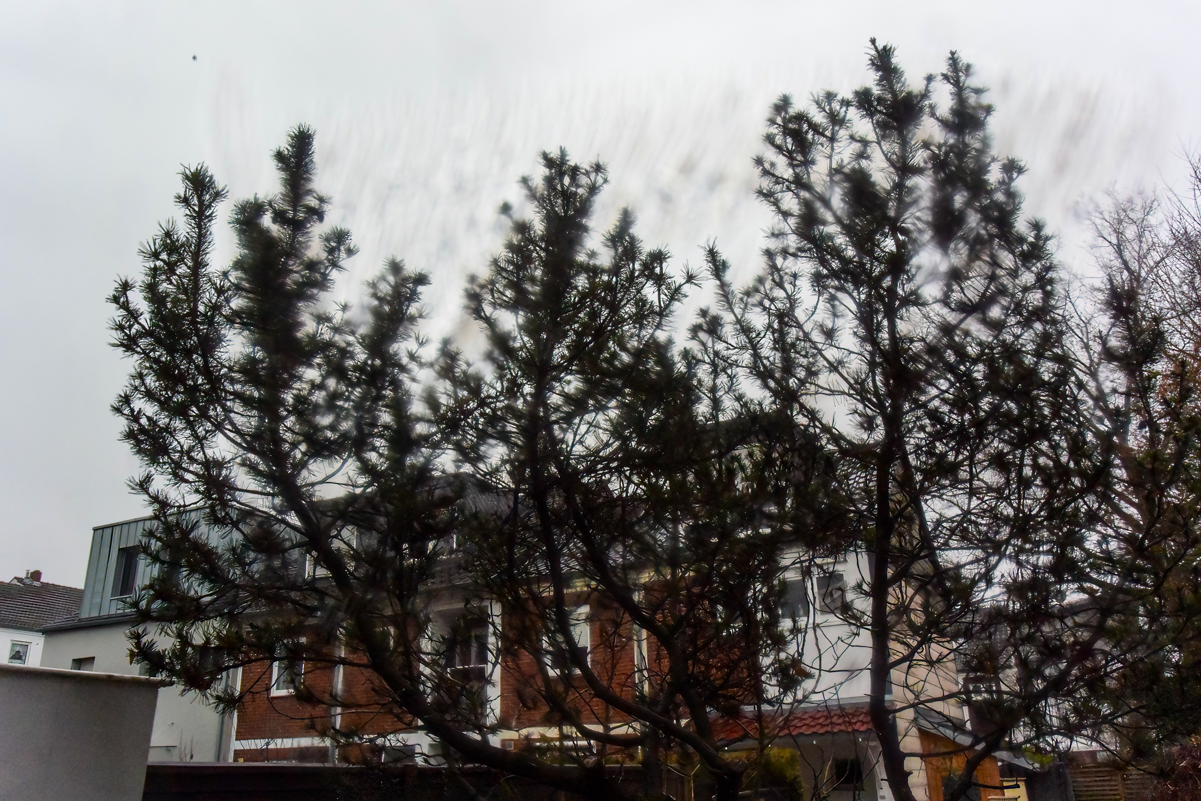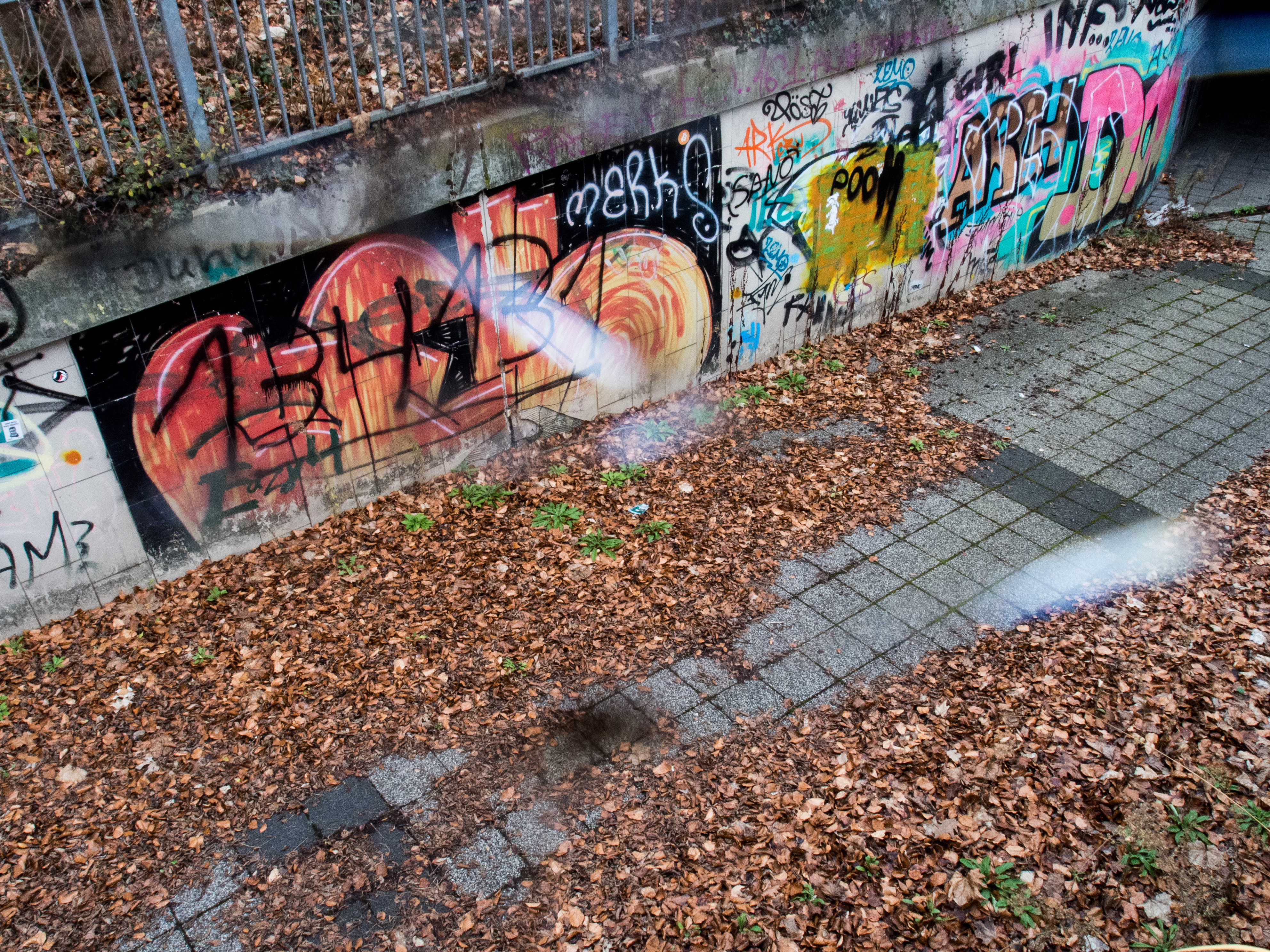 Je nach Motiv die Olympus einfach auf den Kopf stellen und so fotografieren. Von links nach rechts: "normale" Kamerahaltung, Kamera auf den Kopf, Verbesserungsversuch mit Lightroom. Das ist natürlich keine Art, zeigt aber nochmal die Wirkung der Reflektion der schrägstehenden/-verlaufenden Risse im Frontlinsenglas.