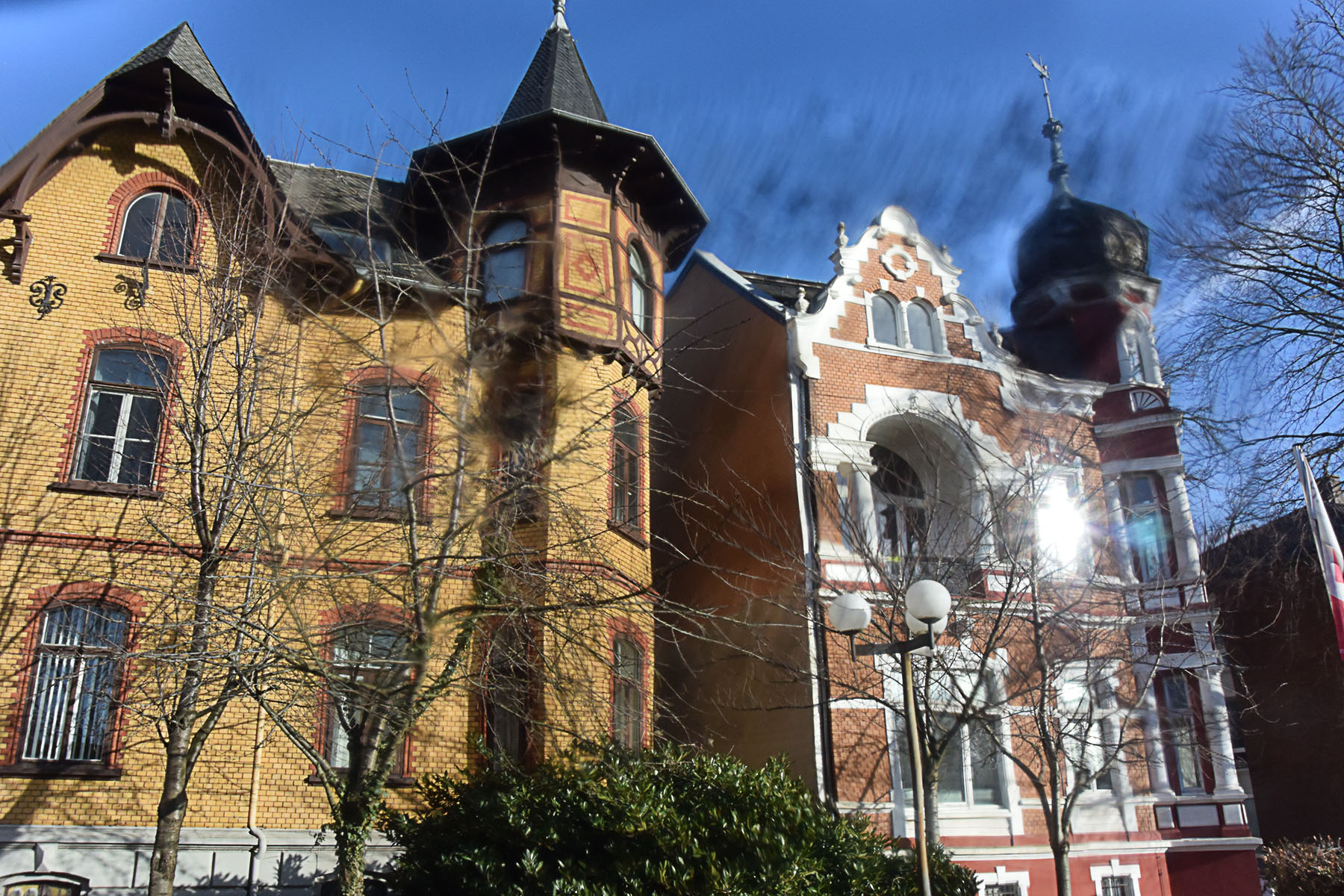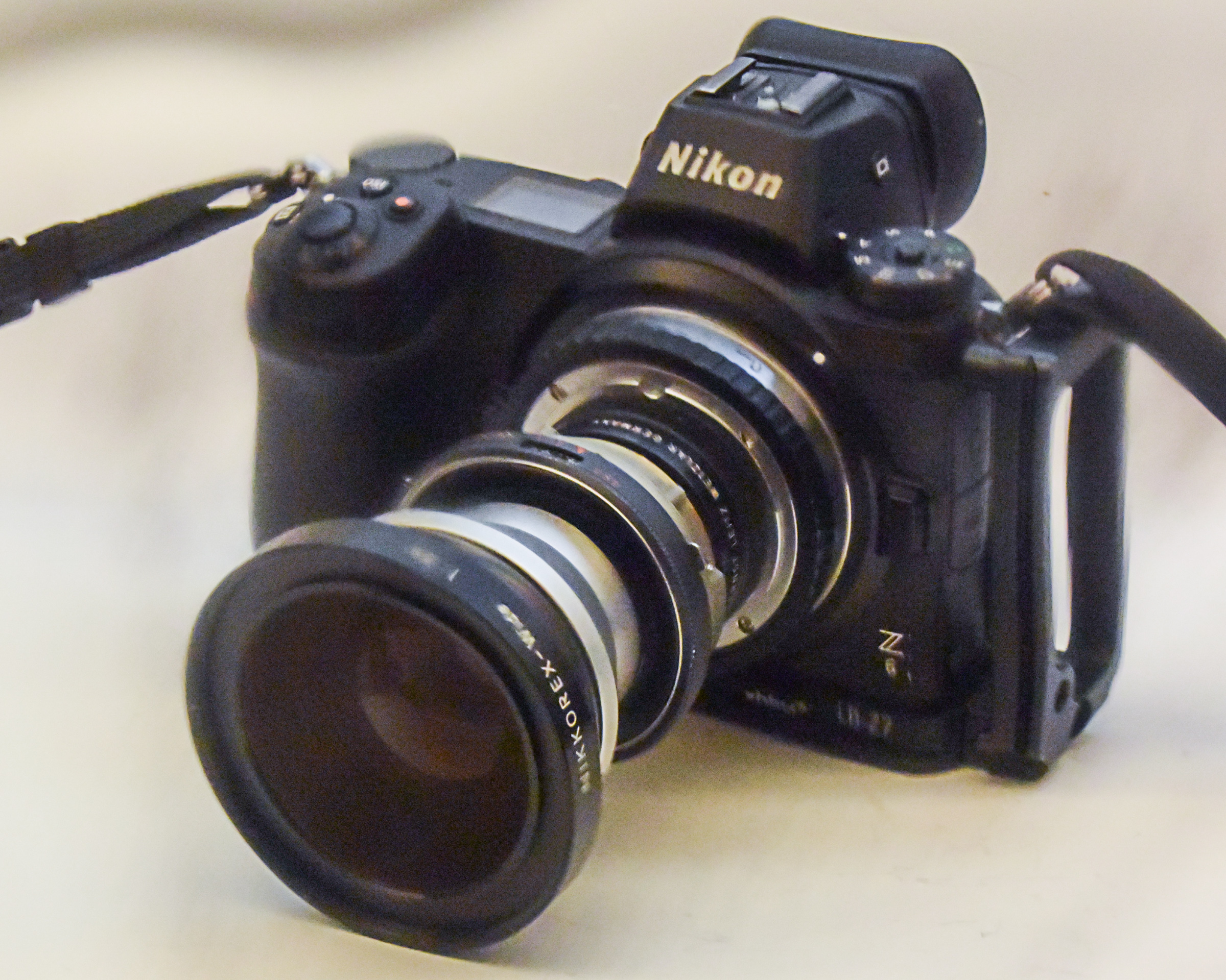 Der Revolversucher russischer Produktion aus Contax-/Leica-Messsucherzeiten. Eingedreht sind 28 mm Brennweite. Die ja gut zur kürzesten Brennweite des 10-30 mm Nikon 1 Zooms passen. KB-äquivalente 27 mm. Fürs Foto den Sucher nur lose aufgelegt, für einen späteren Rundgang mit kräftigem Doppelklebeband gesichert.