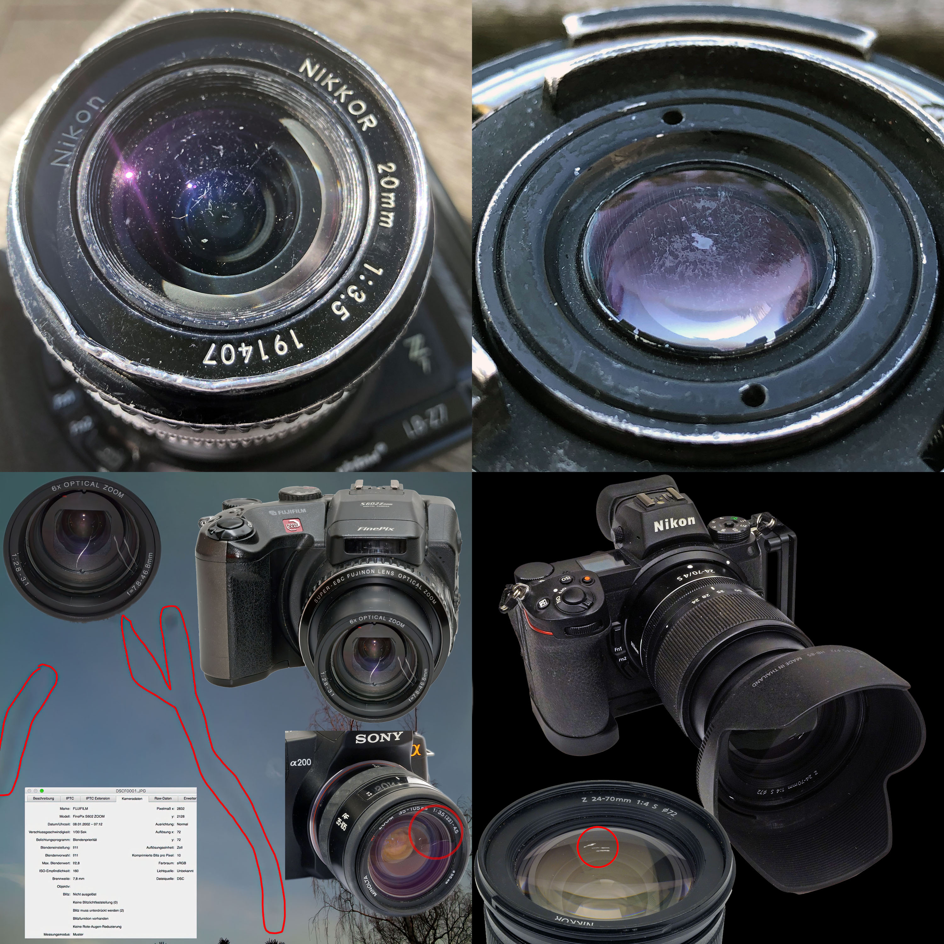 Links unten: Einst auch von einem Flohmarkt mitgenommen, die FUJIFILM FinePix S602 Zoom. Deren Frontlinsenschaden hat nicht diese extreme Wirkung wie bei der Olympus Stylus XZ-2! Man beachte das Kapitel: "Das war so nicht geplant: Ostern 2018 mit extrem fotogenem Wintereinbruch". Unter die Fuji einmontiert noch meine verflossene Sony Alpha 200, bestückt mit einem MINOLTA AF ZOOM 35-105mm 1:3.5 (22) - 4.5. Seinerzeit „dank“ eines Kratzers auf der Frontlinse gekauft, um ein preiswertes Objektiv mit Minolta A-Bajonett zu haben. Von dem unübersehbaren Kratzer war auf keinem fertigen Bild etwas zu erkennen!