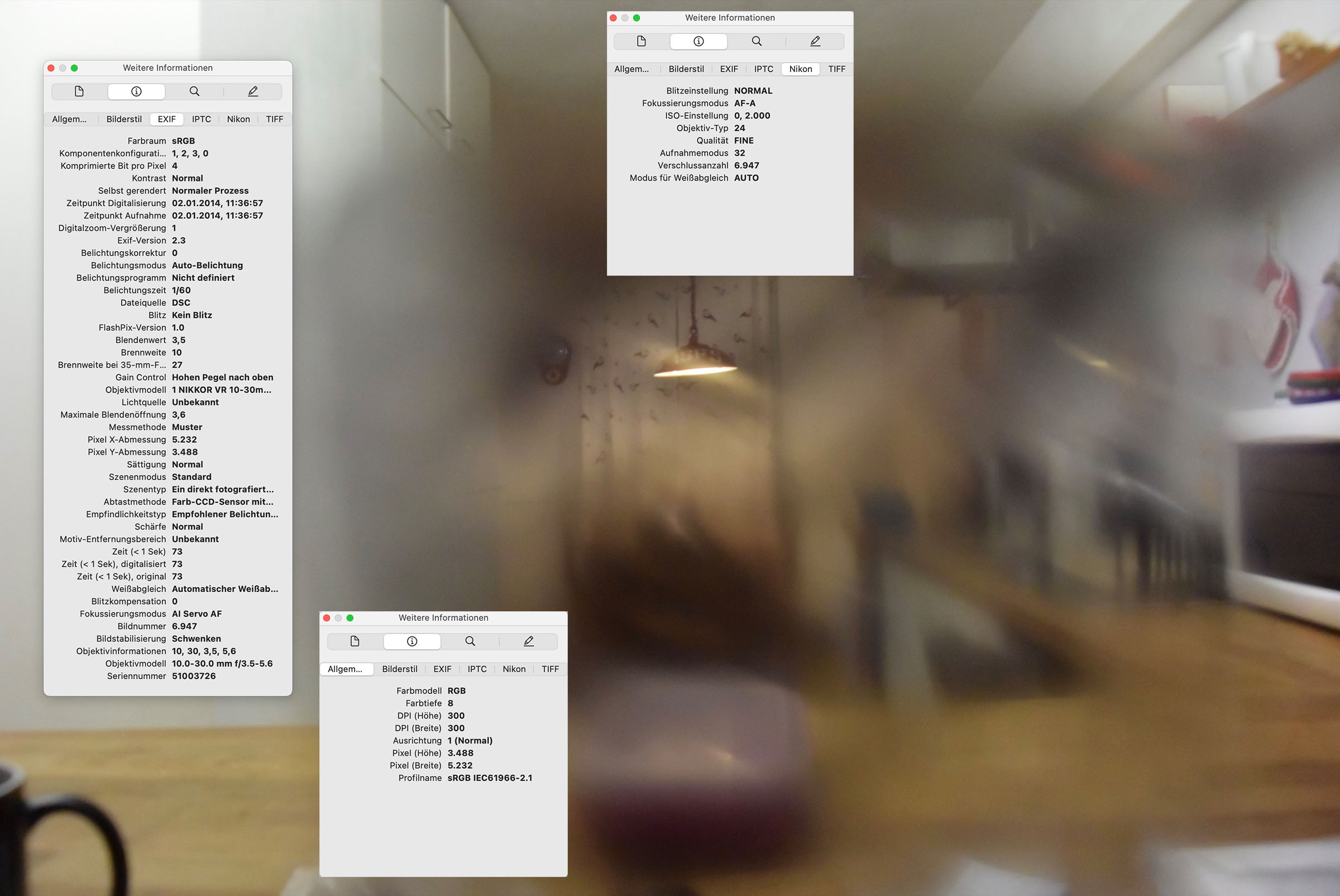 Leider wurde die Nikon 1 V3 von keiner probierten Tether Software erkannt, um über den Weg der USB-Kabelverbindung Rechner/Kamera etwas zu ändern. So hatte ich sie einstweilen beiseite gelegt. Um dann festzustellen: Die lebt ja immer noch! microSD-Speicherkarte und geladenen Akku eingelegt und einfach mal blind in die Küche fotografiert. Und siehe da — einwandfrei getroffen!
