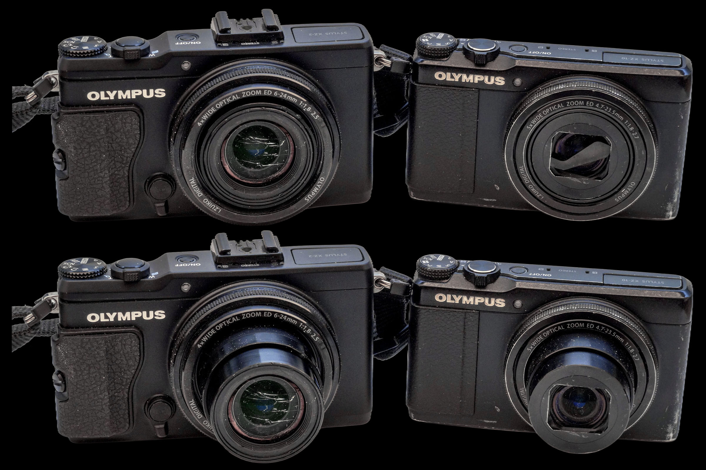 Dass die Olympus STYLUS XZ-2 (links im Foto) kaum noch zu gebrauchen ist, lässt sich noch aus einem anderen Grund verschmerzen. Ist doch da noch die ein Jahr jüngere sensorstabilisierte 12 Megapixel Olympus STYLUS XZ-10 (rechts im Foto) aus dem Vorstellungsjahr 2013 im Bestand. Sie verfügt über ein KB-äquivalentes 1:1.8-2.7/26 -130 mm Zoom. Ebenfalls schwer gebraucht, aber mit intakter Frontlinse! Aber keine Frage, dass die XZ-2 haptisch die bessere Olympus wäre: Mit Klappmonitor und mehr als angedeutetem Handgriff. Es hat nicht sollen sein …