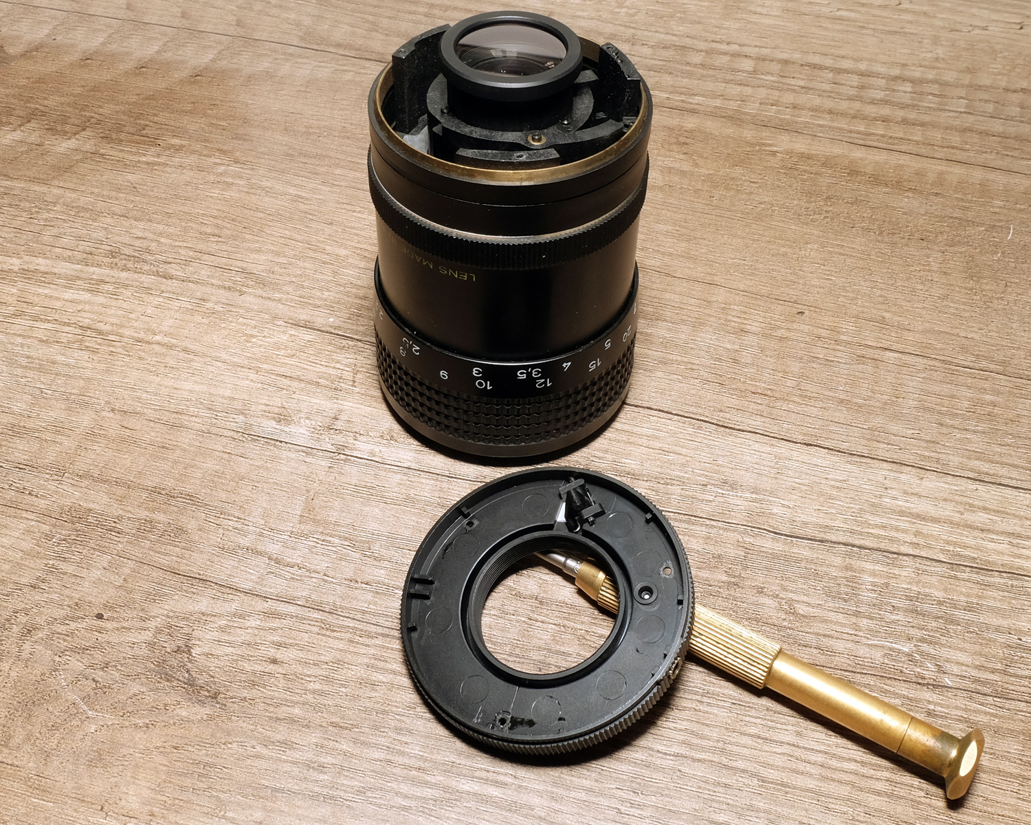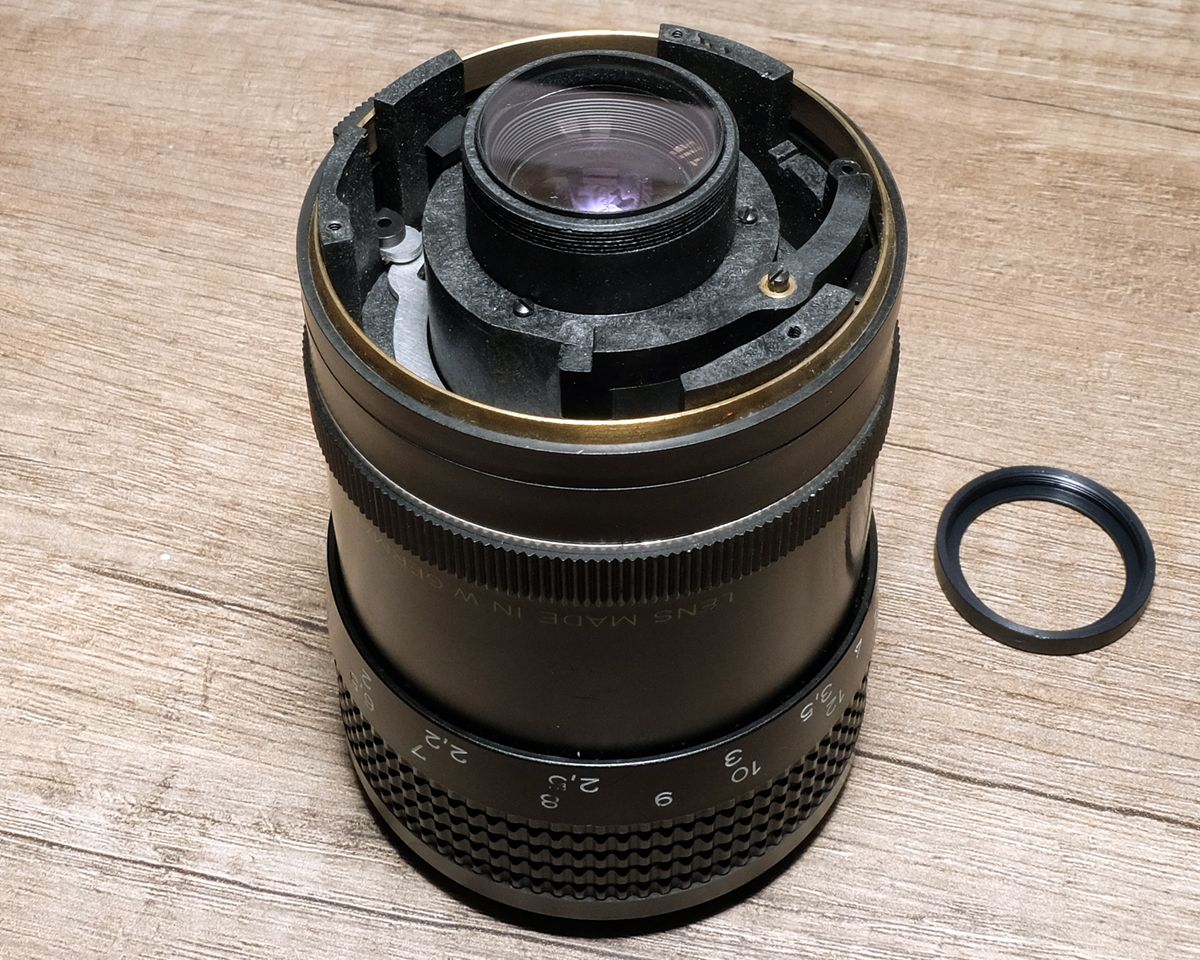 Wie üblich: bei der Montage muß darauf geachtet werden, in welcher Reihenfolge und Richtung die Teile montiert wurden. Die Hinterlinsenbaugruppe erfordert das Abschrauben des M42-Gewinderinges nicht, jedoch kann man den Kunststoffring, der die Linsengruppe fixiert, dann besser lösen. Die Frontlinsengruppe ist komplett eingeschraubt, um sie weiter zu zerlegen, muß zunächst ein ins Filtergewinde eingeschraubter Zierring herausgedreht werden.