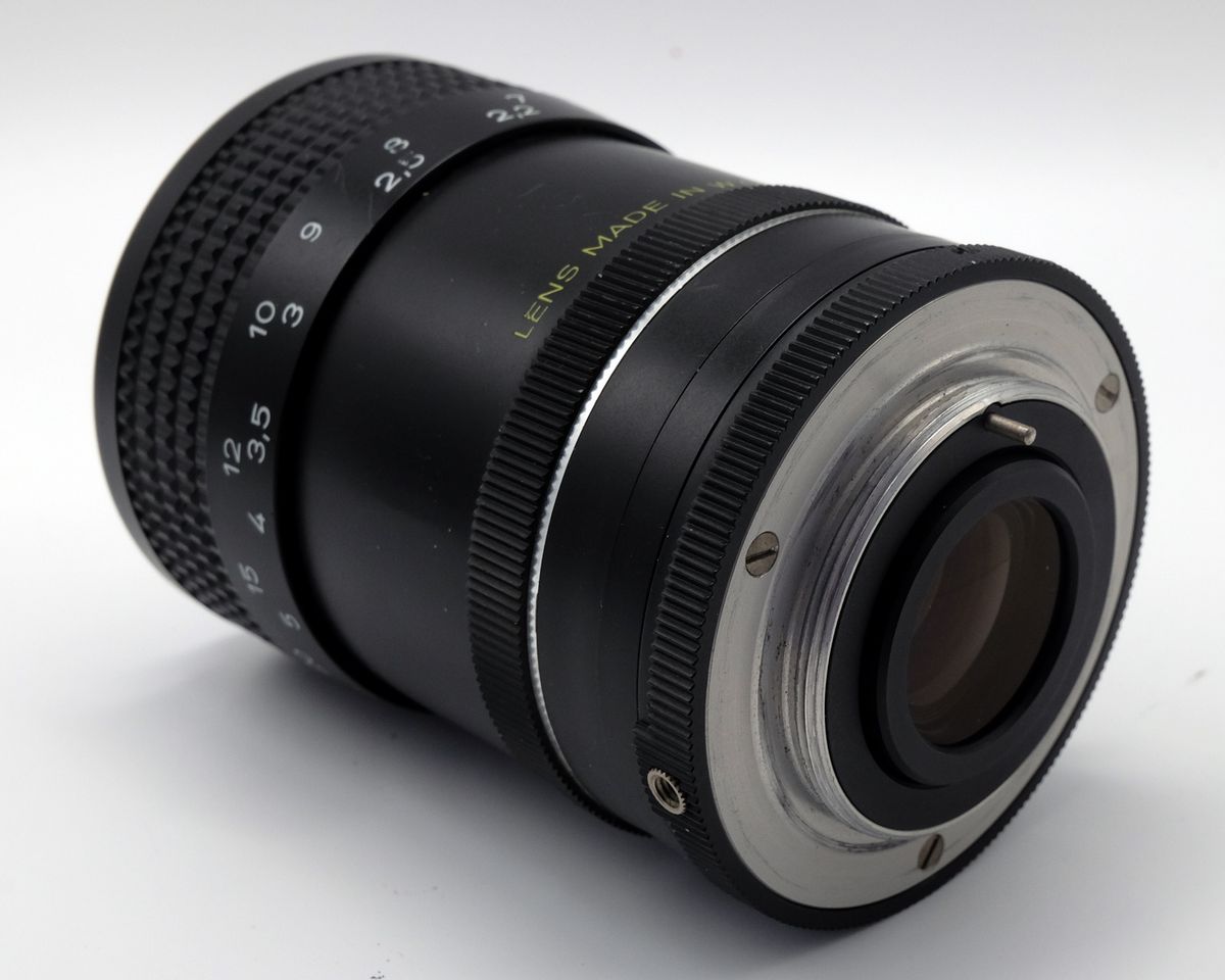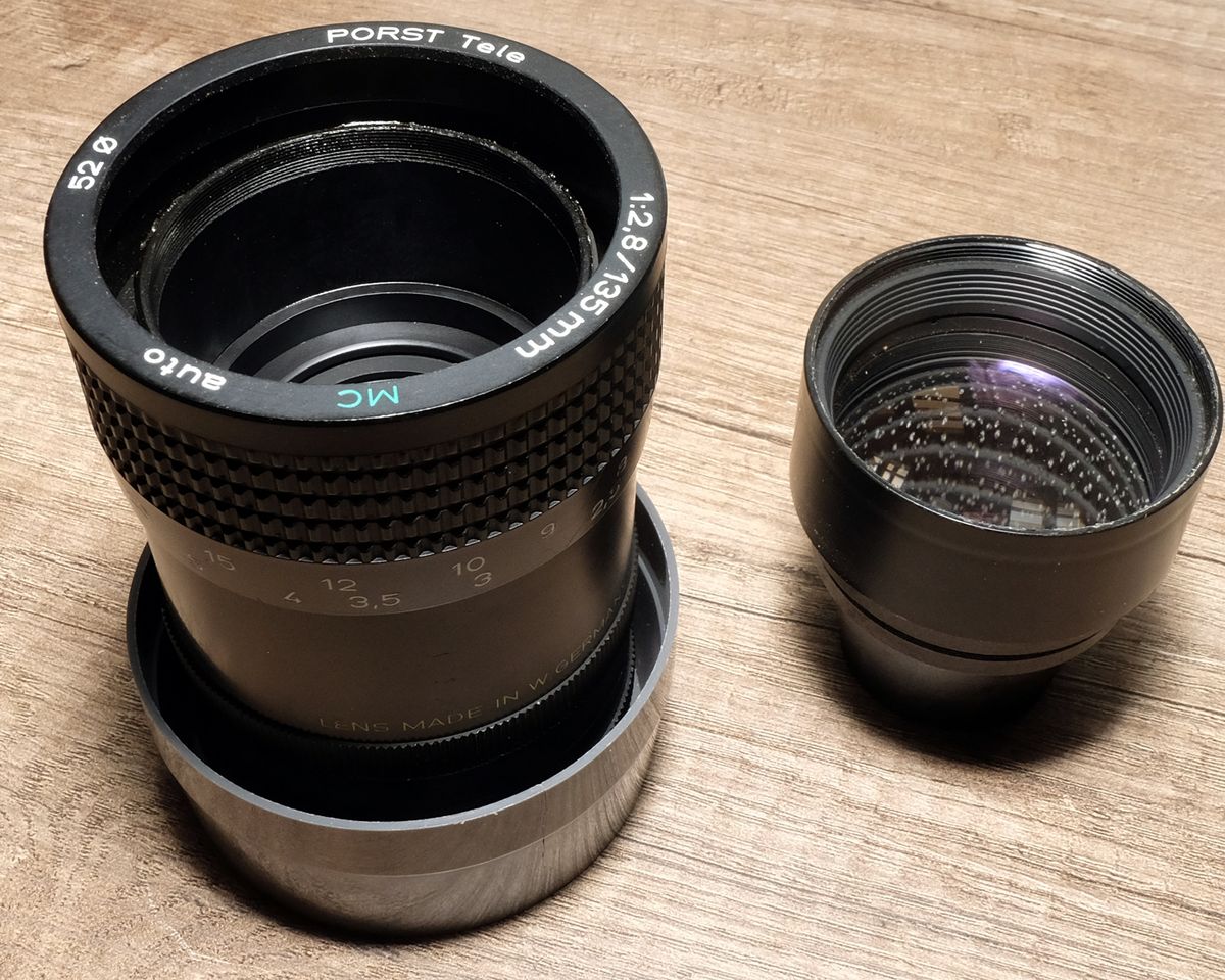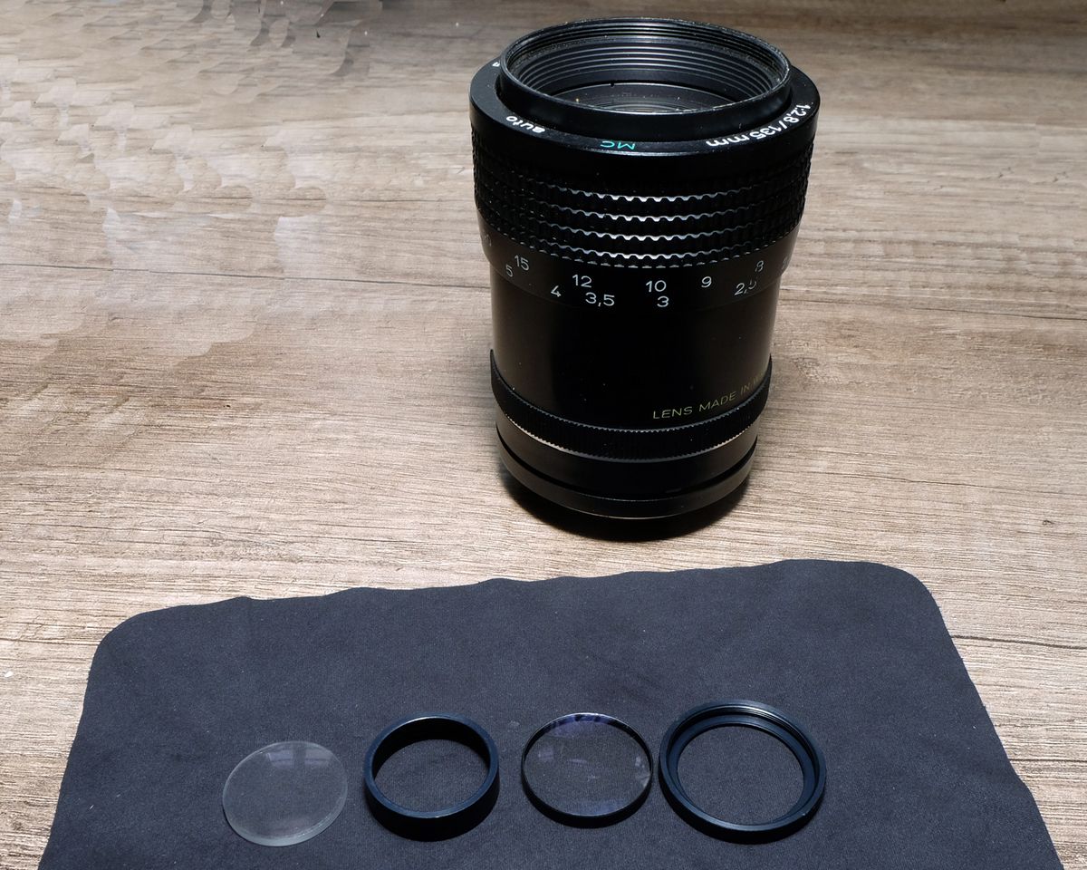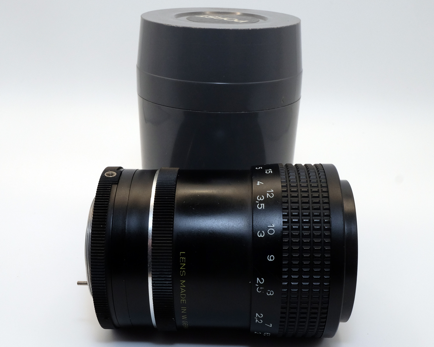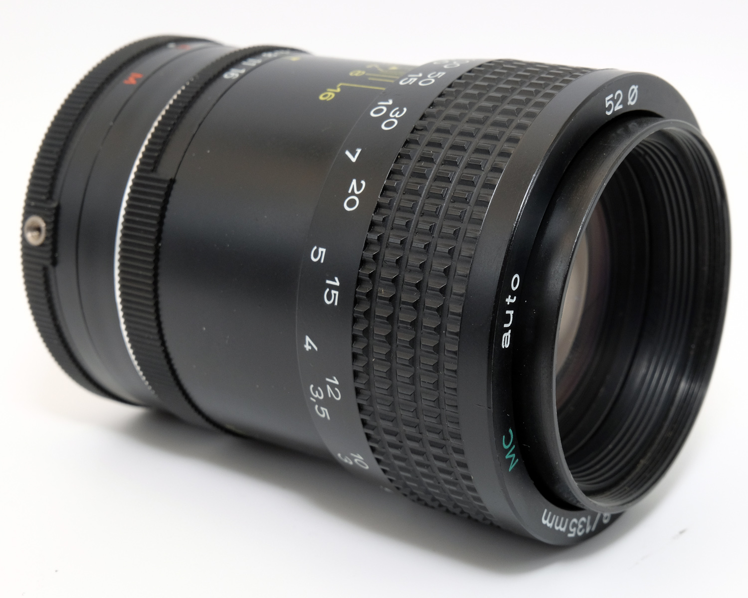 Das gezeigte 2,8/135mm ist ein mehrfachvergütetes Objektiv, die Gravur lautet „Lens Made in W-Germany“. Die optische Rechnung basiert vermutlich auf den Exemplaren aus den 1950er und 1960er Jahren und hat 5 Elemente.