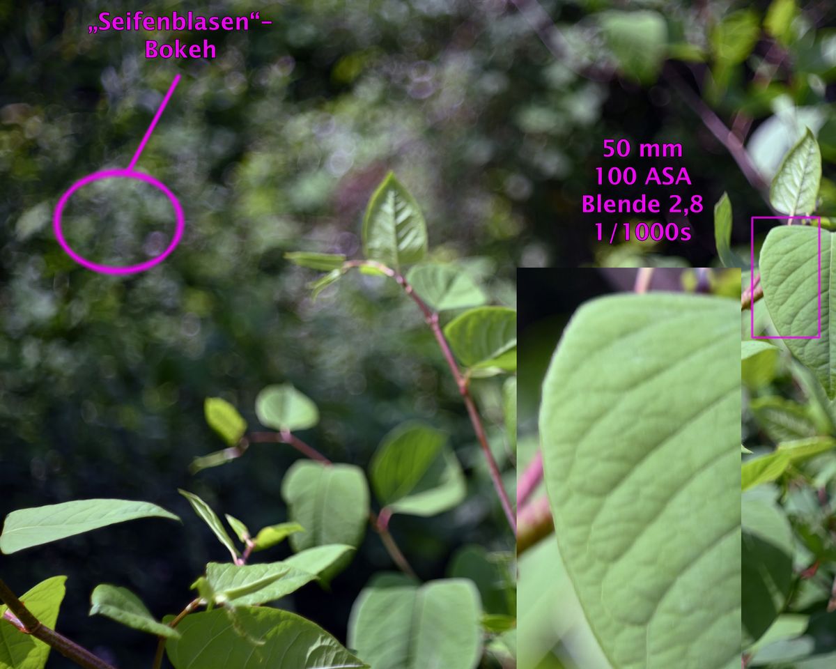 Dieser Objektivtyp hat ein einzigartiges „Bokeh“, also die Abbildung unscharfer Details im Hintergrund. Sie werden „seifenblasen-artig“ und mit leichtem „Swirl“, also einer Art Drehung, dargestellt. Dieser Effekt tritt allerdings fast ausschließlich nur bei Offenblende auf, abgeblendet hingegen nur sehr gering.
