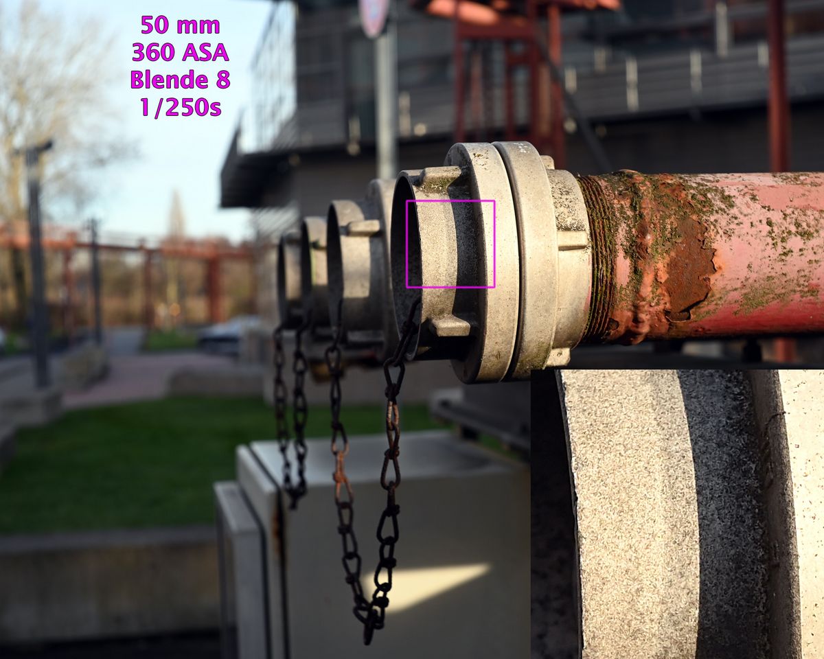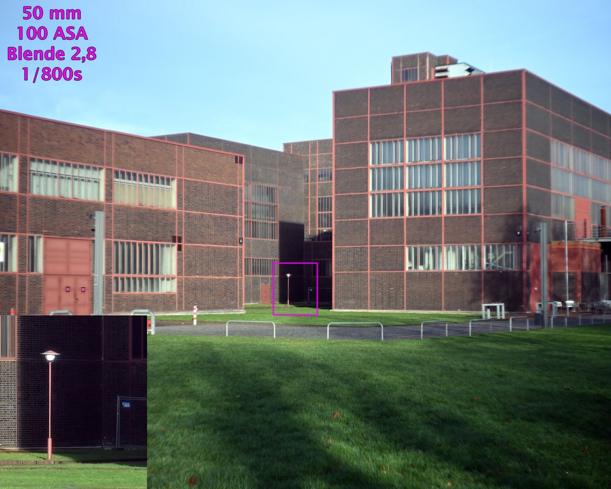 Alle Beispielaufnahmenentstanden freihand bei ASA-Automatik, Zeitautomatik, mit eingeschaltetem Bildstabilisator und bei Blende 2,8 bzw. 8, gespeichert als JPG und bearbeitet mit Photoshop CS4. Bildausschnitt, Helligkeit, Farben, Lichter / Schatten sowie Schärfe wurden korrigiert, die Größe wurde auf 1500 Pixel bikubisch verkleinert. In alle Aufnahmen sind 100%-Ausschnitte vergrößert einmontiert.
