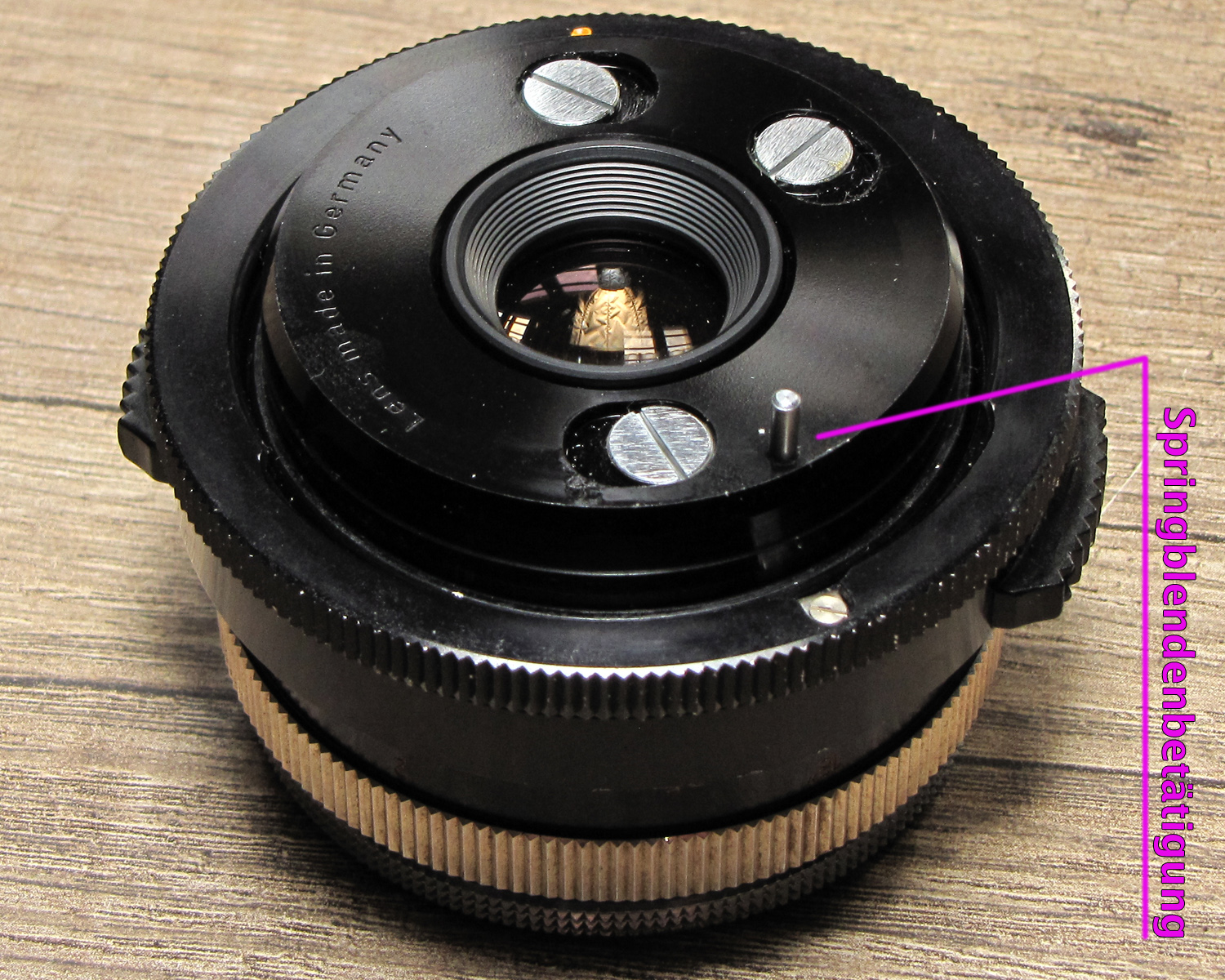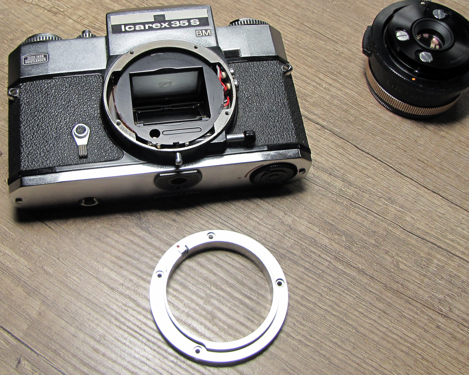 Daß ZeissIkon die Kamera auf M42 umkonstruierten konnte, liegt an zwei Dingen: Der Bajonettanschluß ist ein Ring, der an das Gehäuse geschraubt wird und vom Auflagemaß her mit M42 „so in etwa“ paßt, also mußte nur ein anderer Ring mit M42-Gewinde hergestellt und an die Kamera geschraubt werden. Und die Springblendenbetätigung des Icarex-Bajonetts ist ein Stift, der im Bajonett nach vorn schnellt und einen Stift am Objektiv eindrückt. Dort mußte die Kamera etwas modifiziert werden, indem der Stift durch die Betätigerwippe für M42 ersetzt wurde.