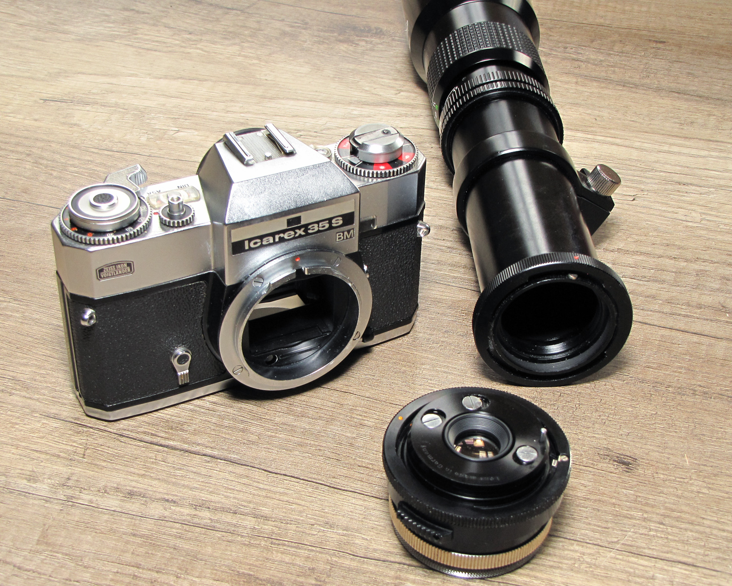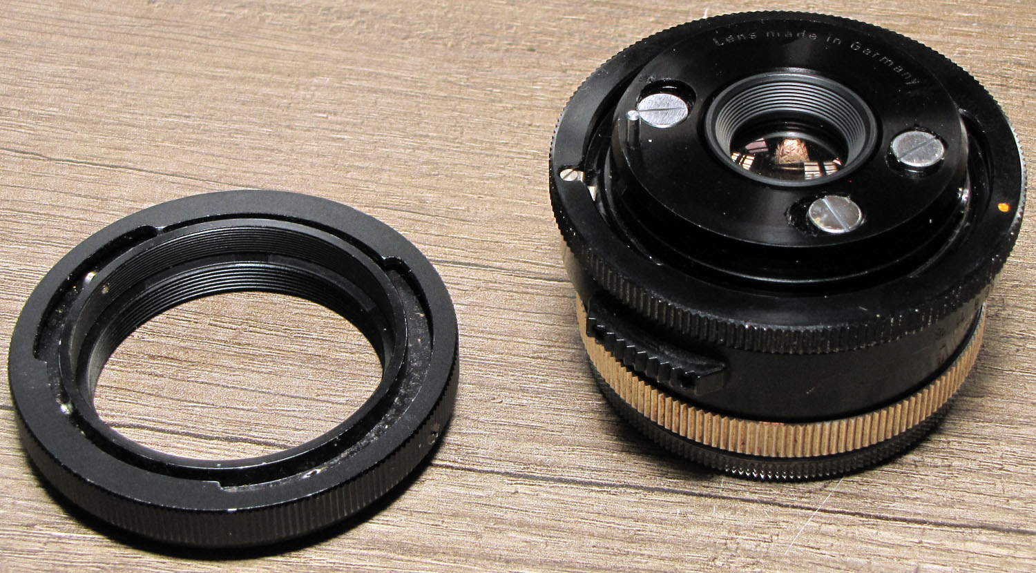 Von Ralf Jannke bekam ich einen exotischen Adapter. Er war der Grund, warum ich die Icarex wieder hervorgeholt habe. Dieser Adapter saß auf einem T2-Objektiv aus Japan, und Ralf wollte wissen, welches Bajonett das sein könnte, Canon FD definitiv nicht. Ich mußte eine Weile über seinem mir zugemailtem Foto grübeln, bis mir die Icarex in den Sinn kam, und ich ihm eine Foto des Bajonetts zumailen konnte. Sowohl die 0-Uhr-Fixierung des Objektivs als auch die zwei Bajonettflansche, die auch noch deutlich unterschiedliche Größe aufweisen, sprachen für Icarex. Ralf sandte mir daraufhin den Adapter, den ich zunächst mit meinem Tessar verglich. Auch ein Ansetzen an die Kamera gelang, somit war meine Vermutung verifiziert.