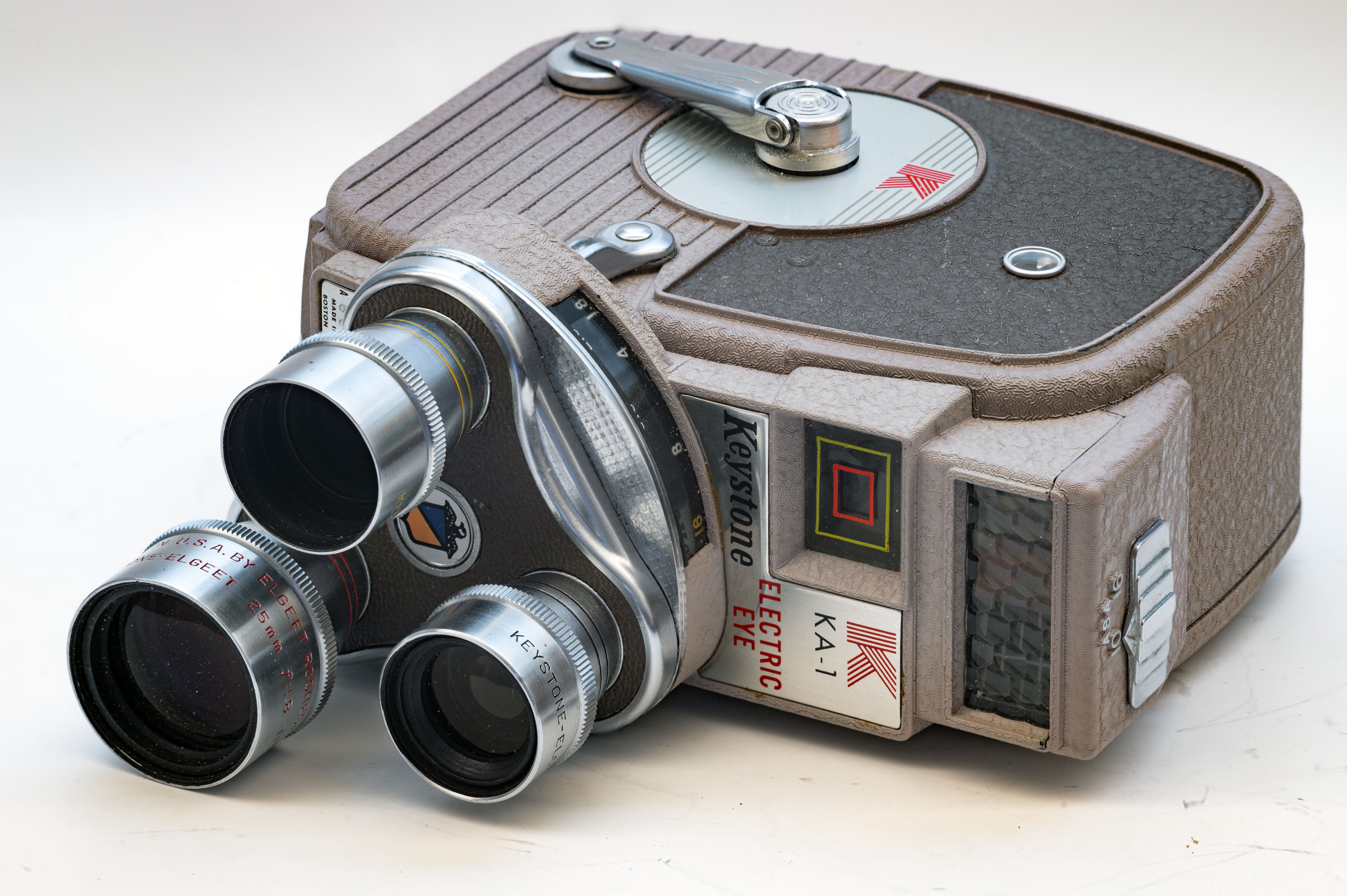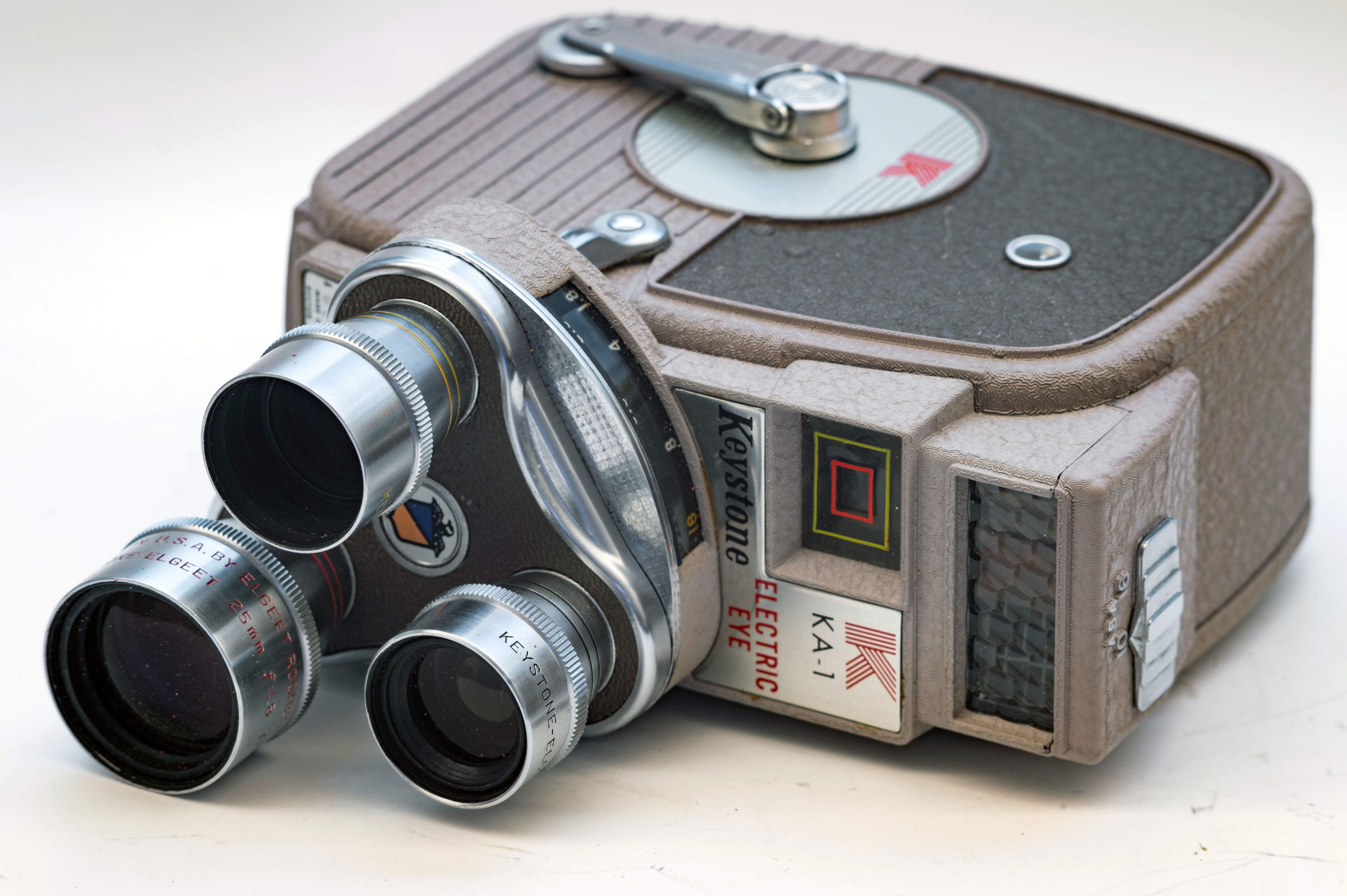 Die Menge/Stärke der Zwischenringe mit Exakta-Bajonett wurde so gewählt, dass die Kamera formatfüllend erfasst wurde. Alle Fotos natürlich vom Stativ, ISO 200, Selbstauslöser (10 s) und Blende f/11. Die nicht reichte, um die komplette Keystone KA-1 ELECTRIC EYE Schmalfilmkamera komplett scharf zu bekommen. Über die Blende f/11 hinaus, hätte die mögliche f/16 oder f/22 vemutlich nicht gereicht – ich habe es erst garnicht probiert – und die Abbildung durch Beugungsunschärfe schlechter werden lassen. Für die bis zur Federwerksmotor-Aufziehkurbel scharfe Abbildung wurde drei Einzelaufnahmen mit drei unterschiedlichen Fokuspunkten aufgenommen. Den Rest, die Verrechnung der drei Einzelfotos zum fertigen Ganzen übernahmen Lightroom und Photoshop.