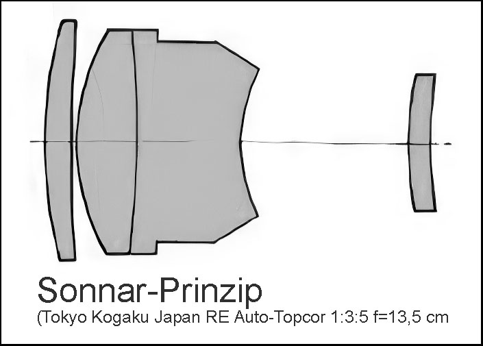 - Optischer Aufbau 4 Linsen in 3 Gruppen (Sonnar-Prinzip)
