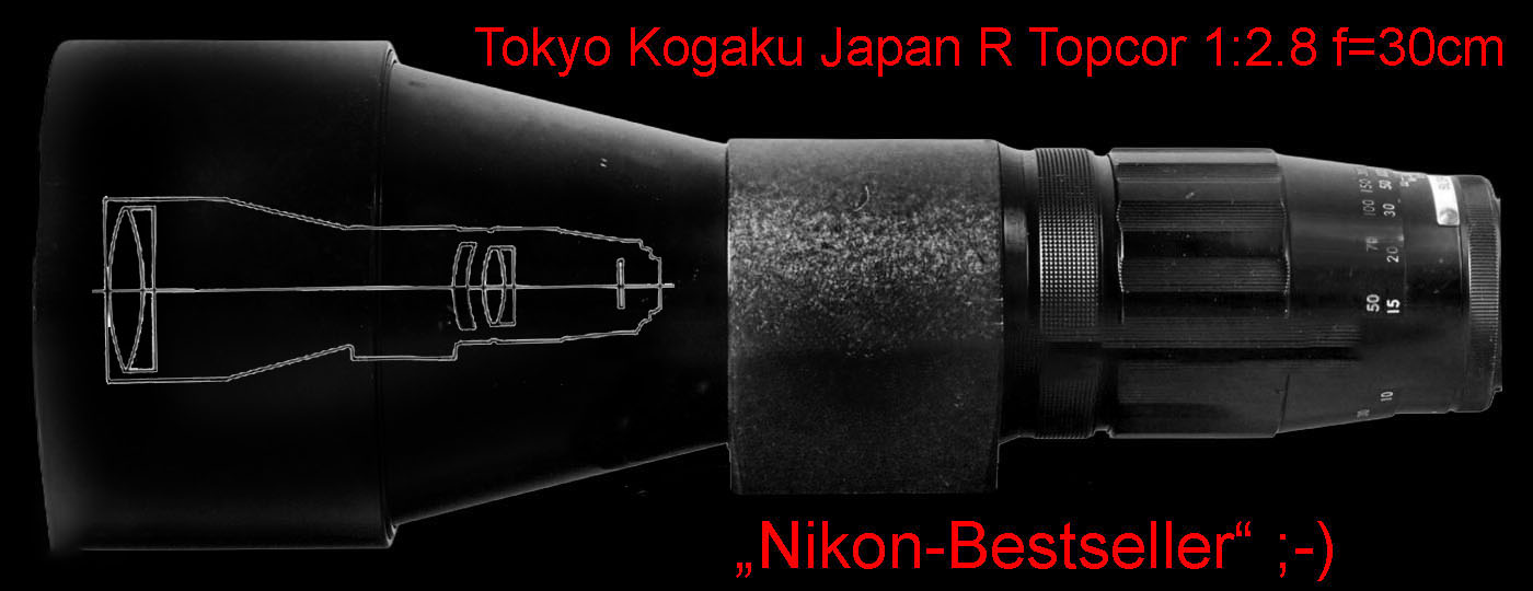 Nikon präsentierte sein erstes 2,8/300 mm 1971, Canon noch fünf Jahre später: 1976. Topcon bot bereits 1958 sein Tokyo Kogaku Japan R TOPCOR 1:2.8 f=30cm. Was angeblich zum „Nikon-Bestseller“ wurde ;-) Eine nicht bekannte Zahl von 30 cm Topcoren sollen vom Topcon/Exakta-Anschluss auf Nikon F-Bajonett umgebaut worden sein …