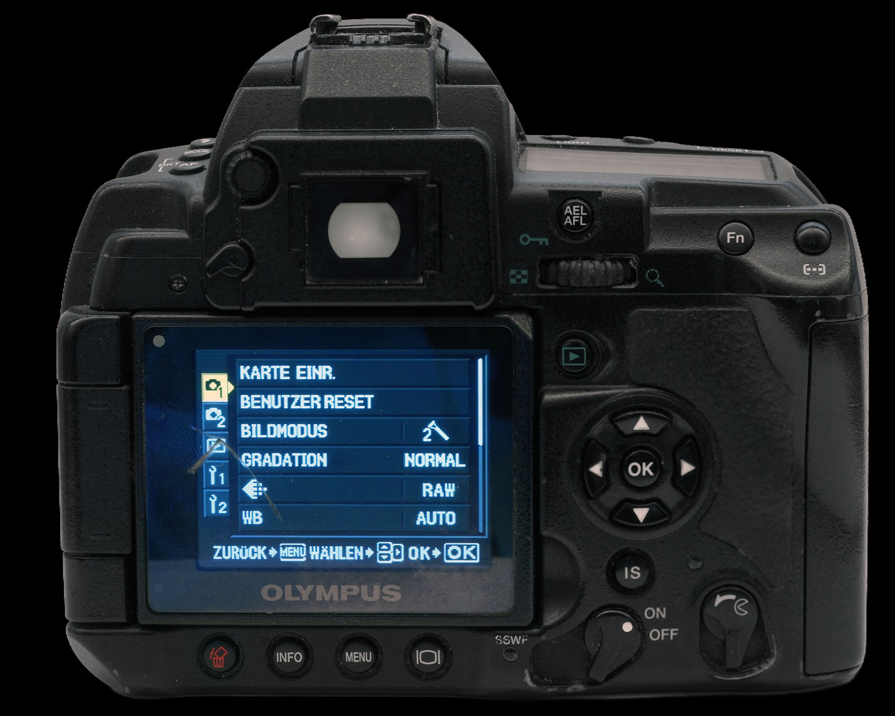 Bei der Belederung hat der Anbieter übertrieben, und der Riss im Display ist nur ein harmloser Riss in der Kunststoffabdekung. Da genügt einstweilen ein Stück Tesafilm. O.K. der eingebaute Klappblitz der E-3 funktioniert nicht. Aber geschenkt, da sich mit einem Aufsteckblitz blitzen lässt. Der fehlende Okulargummi, die Augenmuschel war kein Problem, hier passt einiges Vorhandenes aus meiner E-3xx, 5xx und der E-600.