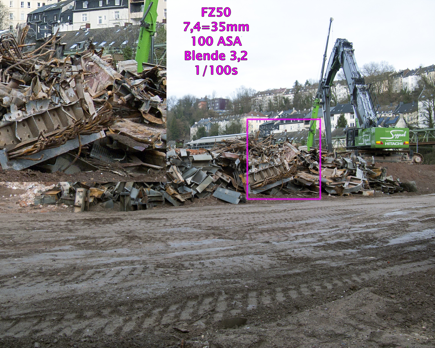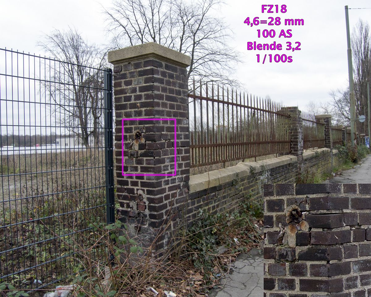 Der Sensor der FZ18 ist erheblich kleiner als der in der FZ50 verbaute (1/2,5“=5,8x4,3mm, Pixelpitch 1,8µm, 8 Megapixel zu 1/1,8“=7,2x5,3mm, Pixelpitch 1,9µm, 10 Megapixel).