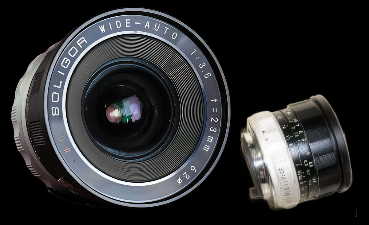 Ich meine, es gibt mindestens noch ein weiteres Objektiv mit dieser "krummen" Brennweite. Was sich im Internet an sogar aktuellen 23 mm Objektiven fand, war teilweise hochlichtstark aber durchgehend nur fürs kleine 15x23 mm APS-C Halbformat gerechnet. Und dennoch fand sich im Internet das oben abgebildete SOLIGOR WIDE-AUTO 1:3.5 f=23mm. Ich meine mich dunkel zu erinnern, das in der ersten Hälfte der 1970er Jahre sogar mal gehabt zu haben. Und wenn im Internet der Vertreiber Soligor auftaucht, sind Hanimex & Co. nicht weit. Am interessantesten an diesem 23 mm avanar Analog-Superweitwinkel ist die kurze Nahdistanz von 27 Zentimetern.
