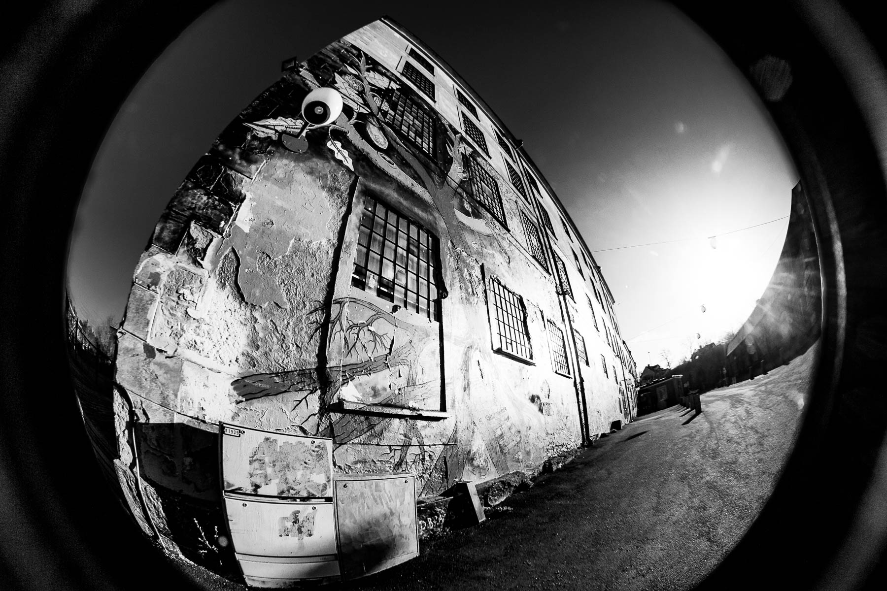 Funktionstest bestanden! Reichlich Vignettierung, exakter Randabschattung durch die natürlich nicht für das Carl Zeiss (gerechnete) Vario-Sonnar 2,8-4,8/14,3-71,5 T* vorgesehe RAYNOX HD-FXR180 HIGH DEFINITION FISH-EYE CONVERSION LENS. Der Vorsatz dürfte von einer Videokamera stammen.