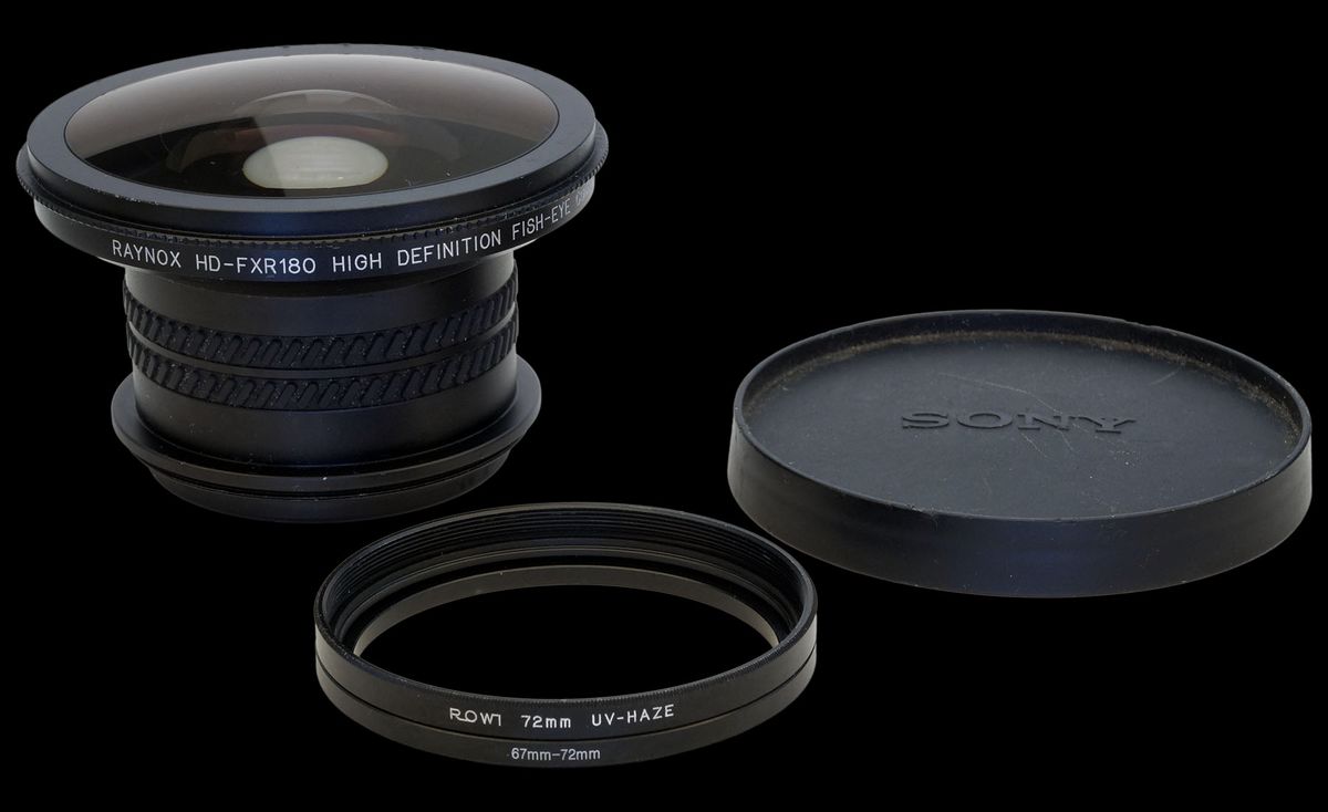 Auf dem Flohmarkt quasi blind gekauft, passt das RAYNOX HD-FXR180 HIGH DEFINITION FISH-EYE CONVERSION LENS mit einem 72 mm Filter, dem das Glas entfernt wurde, und einem vorhandenen Filter-Reduzierring 72 mm-auf-67 mm tatsächlich auf die ungeliebte Sony Cyber-shot DSC-R1.