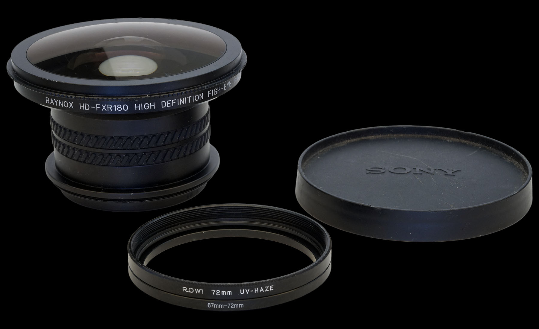 Das einzige Risiko der gezeigten 15 Euro Flohmarkt-RAYNOX HD-FXR180 HIGH DEFINITION FISH-EYE CONVERSION LENS könnte in der Inkompatibilität zum Sony Cyber-shot DSC-R1 Zeiss Zoom bestehen. Die geplante Montage war schnell sichergestellt. Ein 72 mm Filter, dem das Glas ausgebaut wurde und ein Reduzierer 72-auf-67 mm. Alles aus der eigenen Wühlkiste! Sollte das harmonieren, würde das meinen Spaß an der ungeliebten Sony R1 mächtig verbessern ;-)