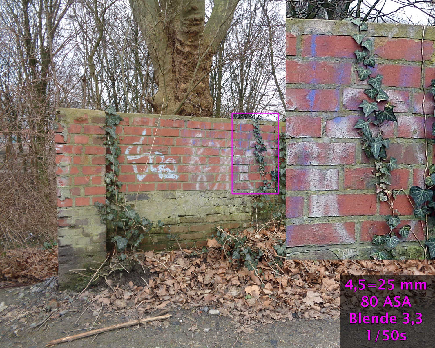 Da das Objektiv am langen Ende recht lichtschwach ist (1:6,3), sollte die eingebaute optische Bildstabilisation unbedingt eingeschaltet bleiben, um freihand ein unverwackeltes Bild zu ermöglichen. 25mm war damals für Einsteiger-Kompaktkameras ein starkes Weitwinkelobjektiv.