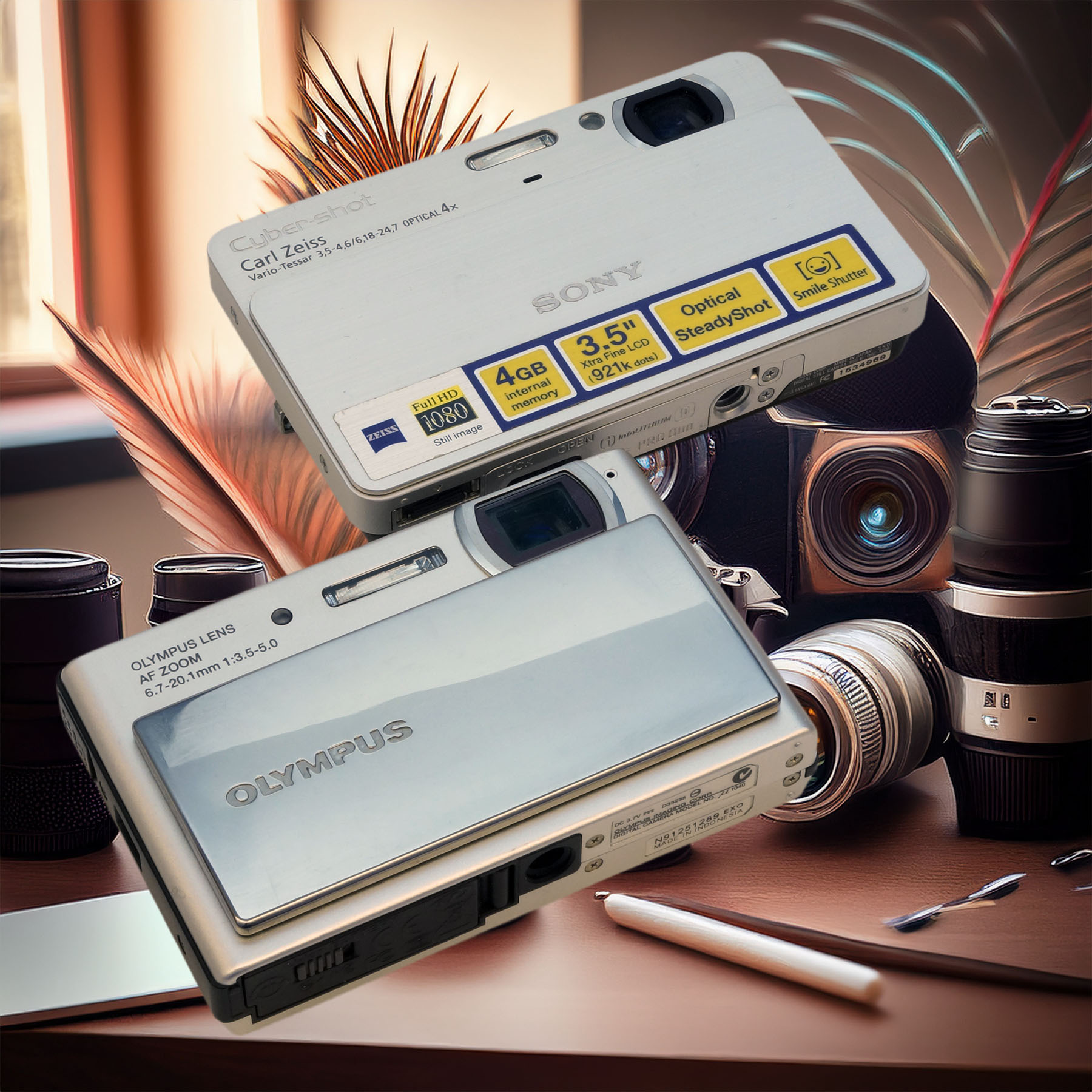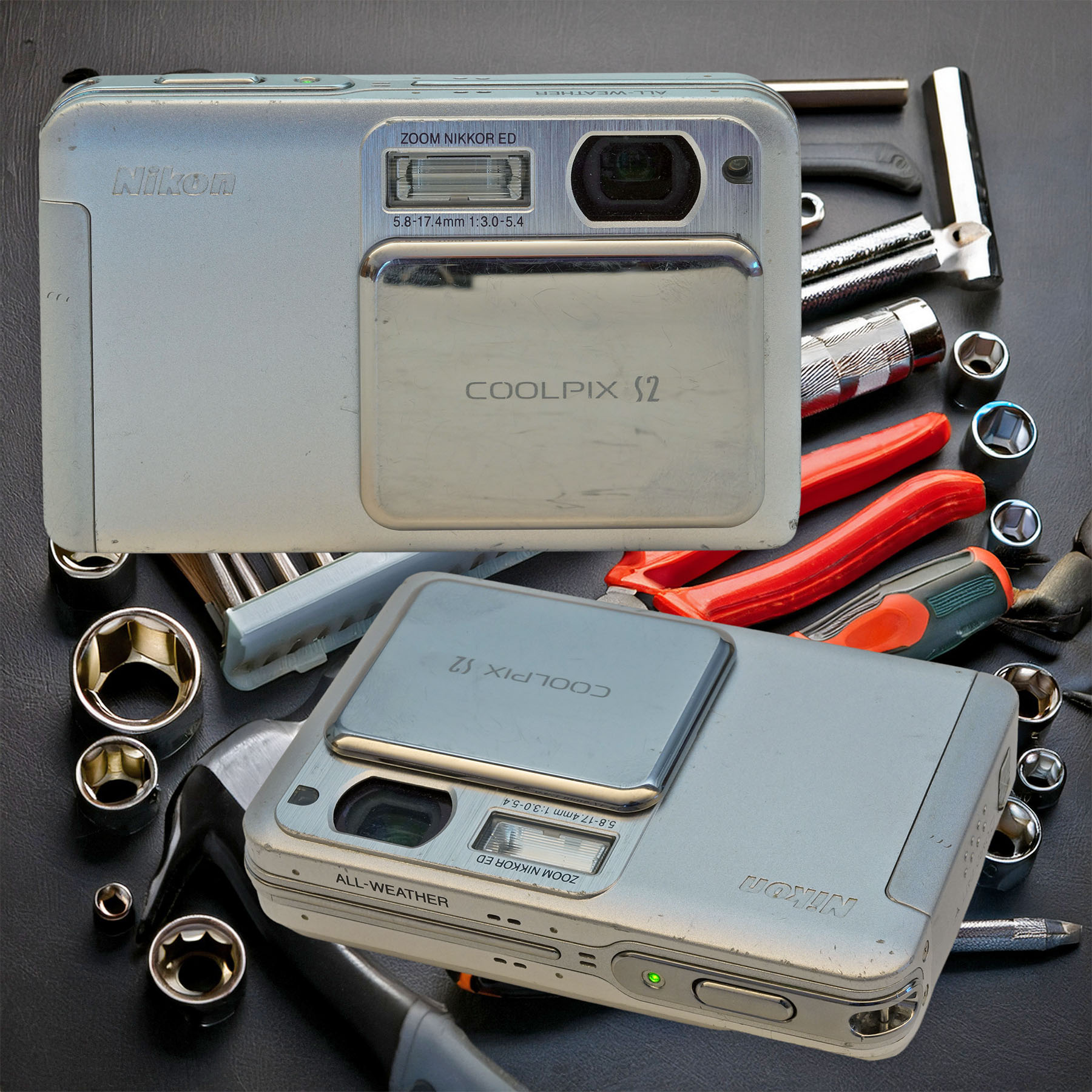 Nach Studium der alten Praxisberichte war die Olympus µ1040 gleich aus dem Rennen: "Außen Hui, innen Pfui …" Keine Frage, dass die µ1040 viel eleganter, stylischer ist, als die dagegen dicke Nikon COOLPIX S2. Der ich deshalb auch den Photoshop-Werkzeughintergrund verpasst habe.