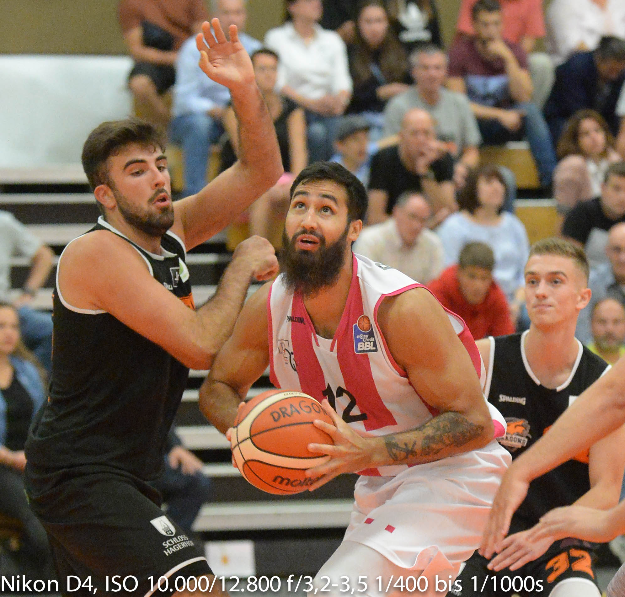 Jedes Jahr im September lädt der Kooperationspartner der Bonner Basketballer zum Mini-Tournier am Fuße des Rhöndorfer Drachenfels'. Von dieser Lage hat die Spielstätte der "Dragons" auch seinen Spitzennamen "Drachenhöhle". Die ihrem Namen von der Hallenbeleuchtung alle Ehre macht. Bestehend aus Jahr für Jahr schlechter werdenden Leuchtstoffröhren, die der Hallenmeister möglicherweise aus Kostengründen allenfalls einzeln wechselt, nie aber das komplette Kontingent. Entsprechend muss an der ISO-Zahl der eingesetzten Kamera gedreht werden. Wer glaubt, dass dabei ISO 1600 schon hoch wäre, wird da schnell eines besseren belehrt.