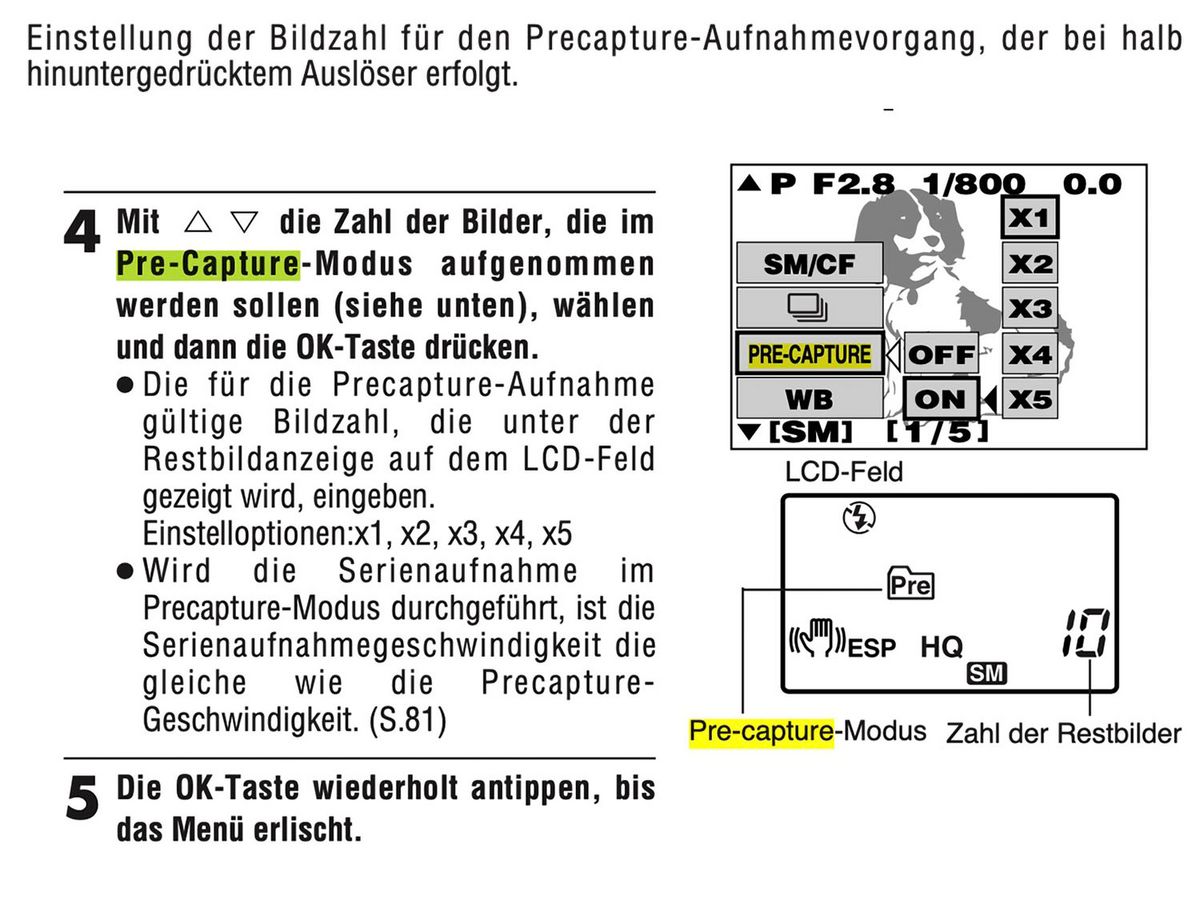 Ja es sind 5 Pre-Capture Aufnahmen plus die 15 per 15 Bilder pro Sekunde aufgenommenen Bilder = 20 Fotos insgesamt! Schon vor 26 Jahren war das möglich!! Womit bei aktuellen spiegellosen Hochleistungs Systemkameras sogar geworben wird. Die Kamera beginnt noch vor komplettem Druck auf den Auslöser zu "denken", zu fokussieren, auszulösen …