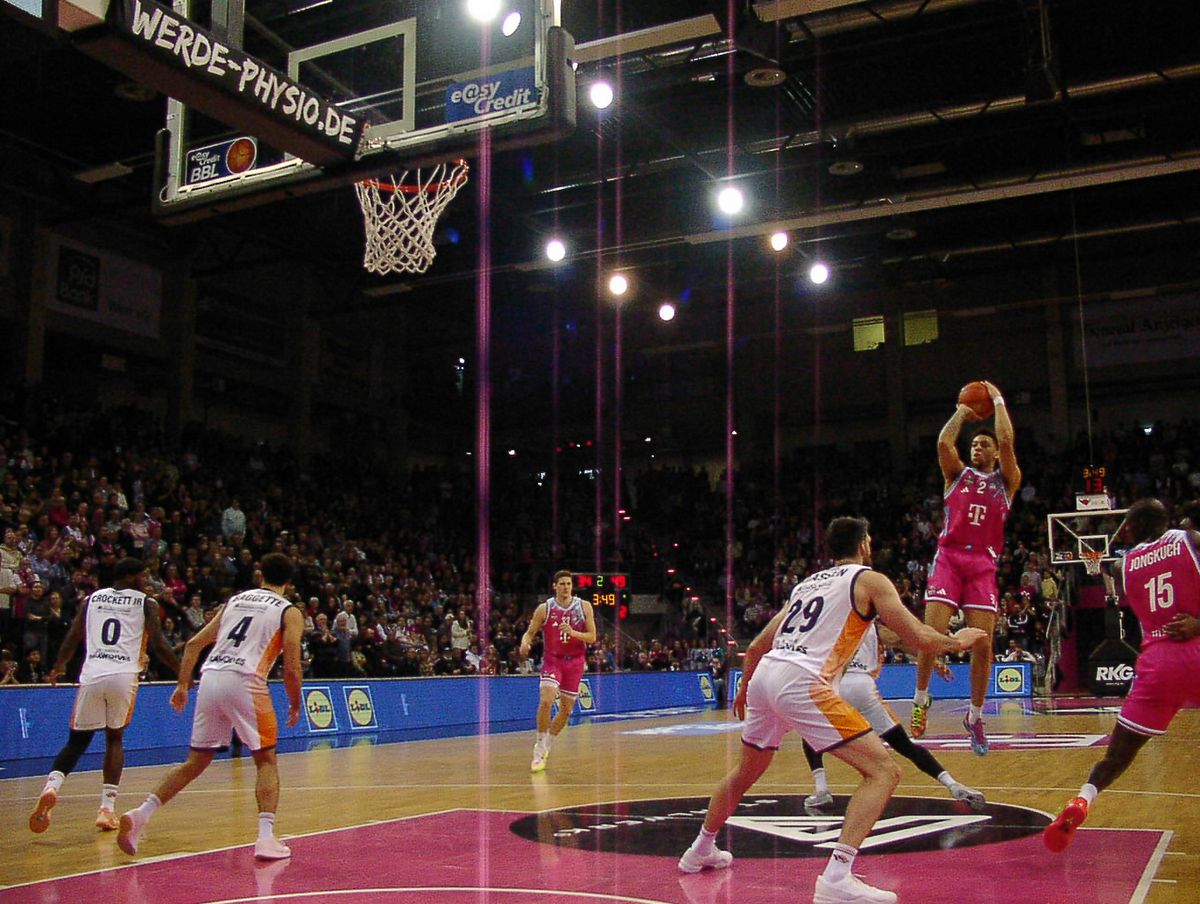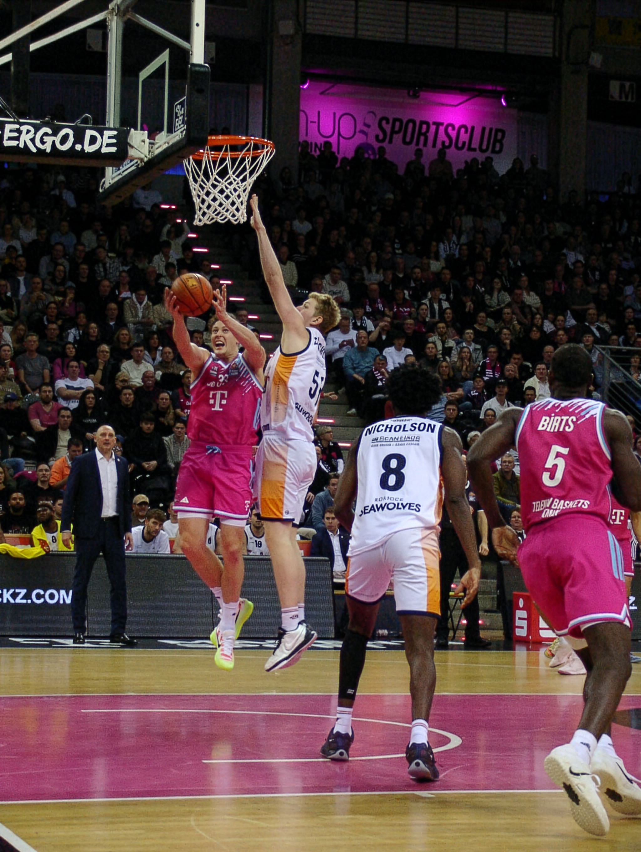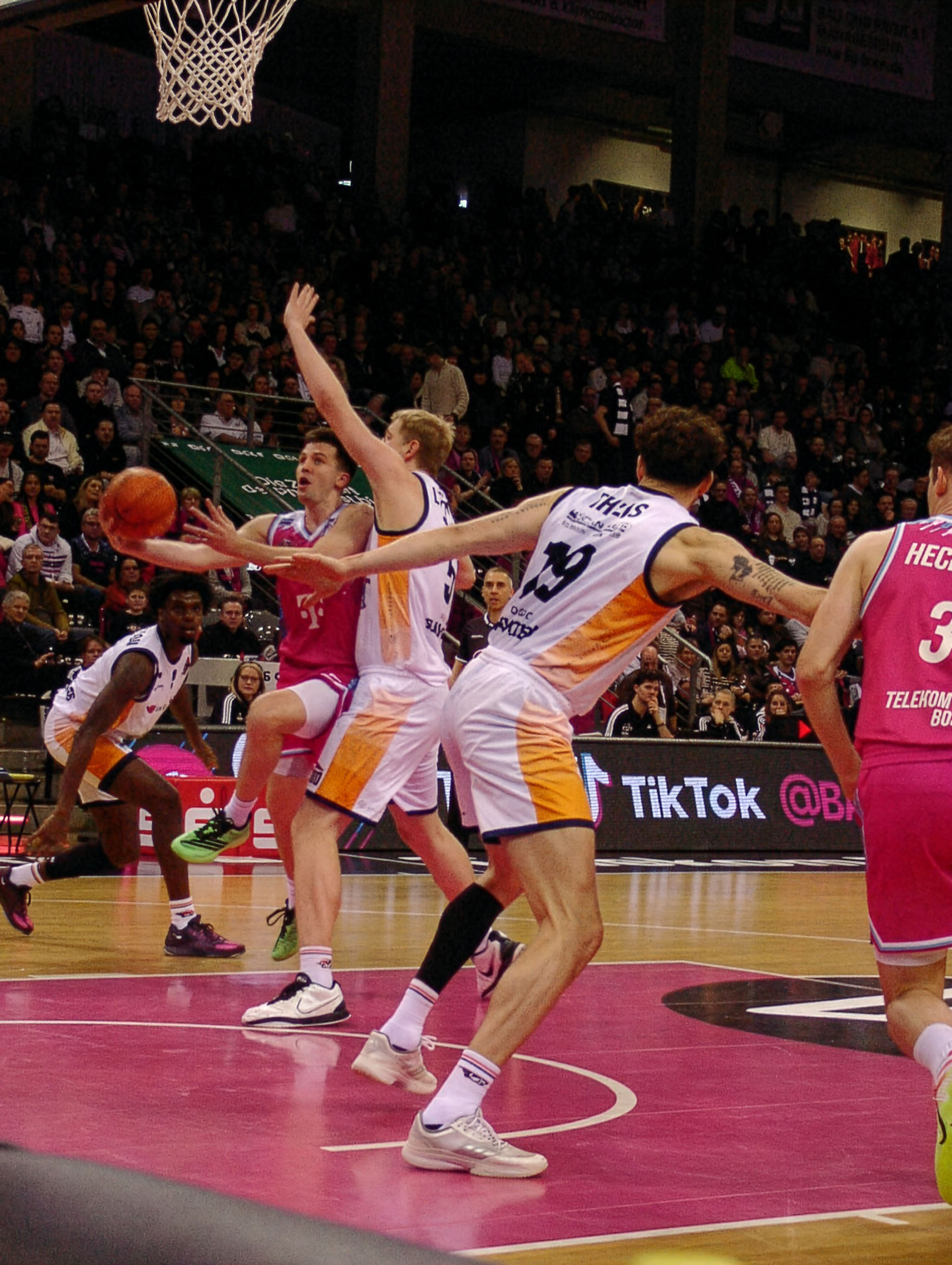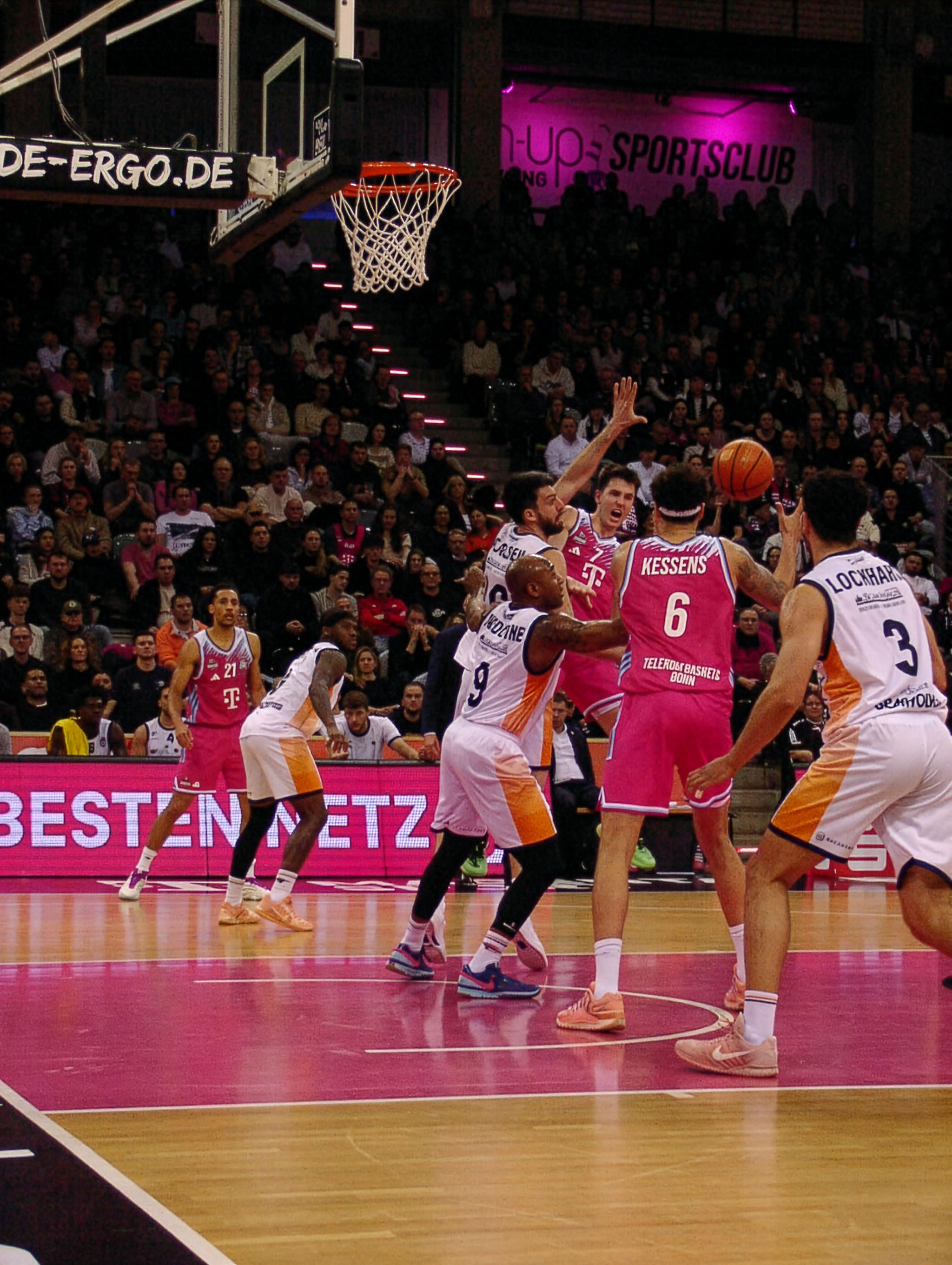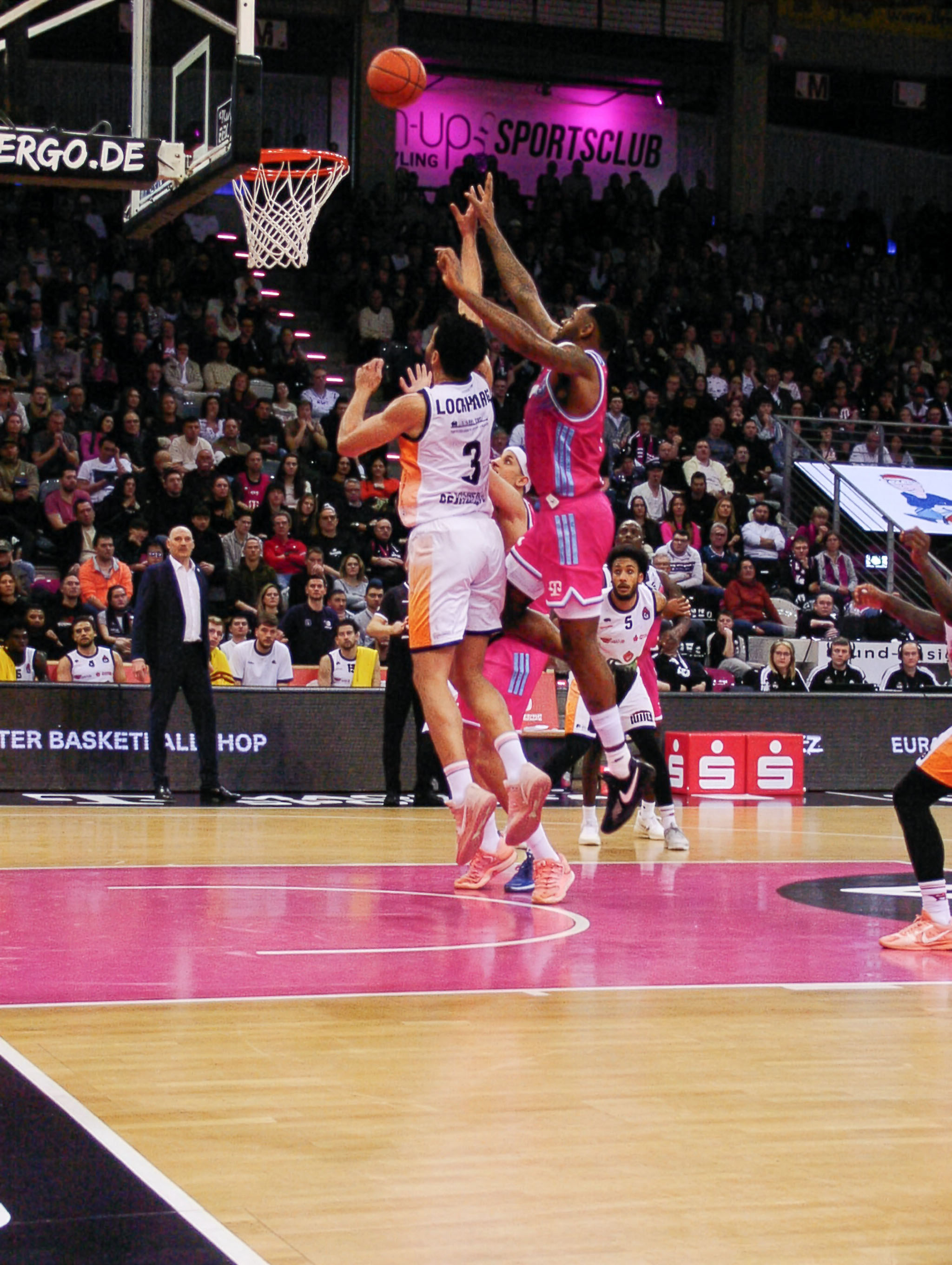 Nach zu vielen Versuchen die schnellen Basketballer mit dem miserabel auflösenden E-Sucher verfolgen zu wollen, habe ich zum Schluss auf Liveview mit dem Monitor umgeschaltet. Der zwar auch keine Augenweide ist, aber mit dem dann die gezeigten Hochformater möglich wurden. Der Fokus wurde auf von der Entfernung passende Bodenmarkierung gelegt, um dann über den Monitor wegschauend auszulösen, wenn sich die Szene anbahnt.