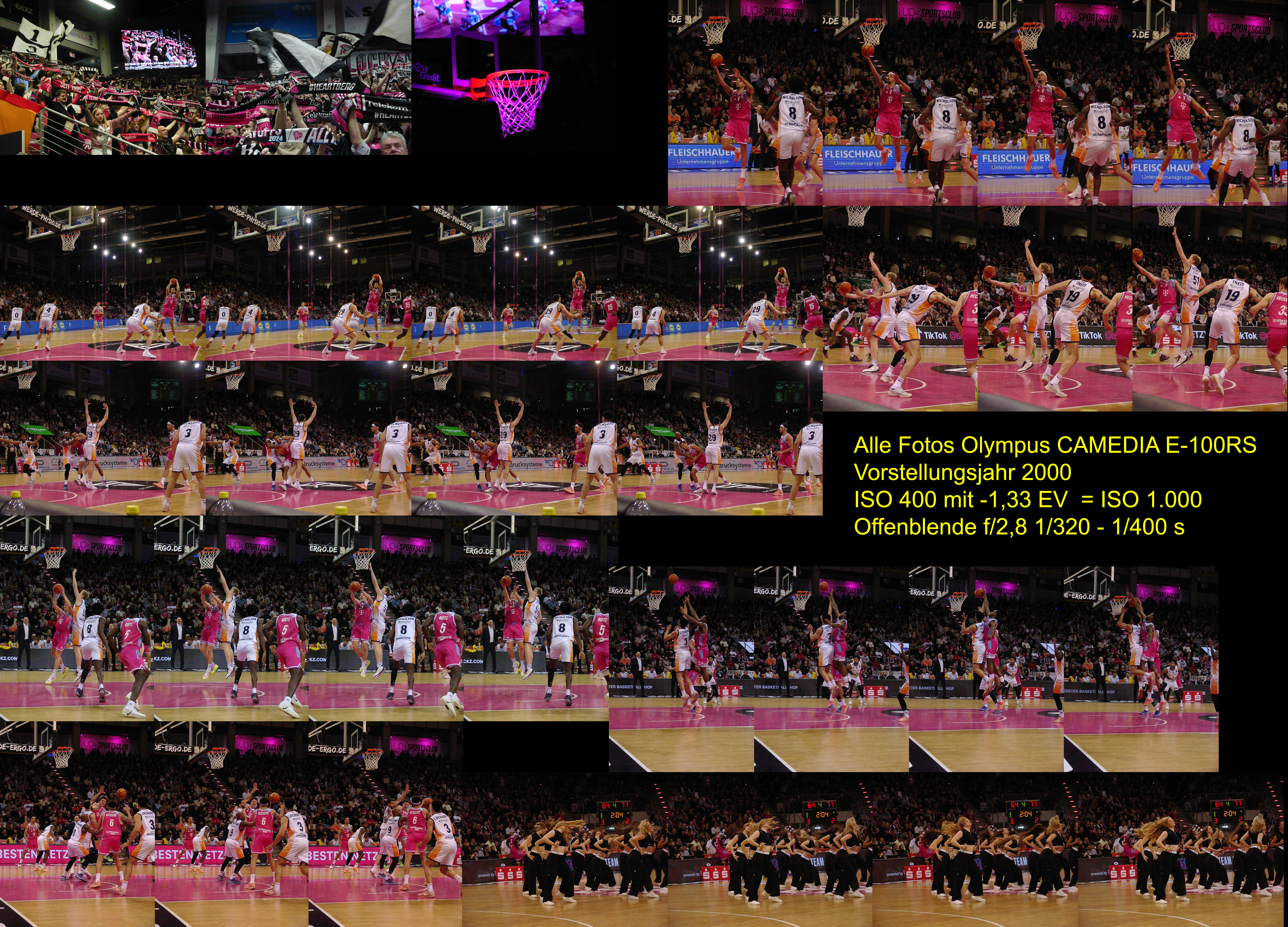 Ich wollte die E-100RS sozusagen "sporttauglich" machen. Also ISO 400 mit -1 EV Unterbelichtung = ISO 800 eventuell sogar -1 1/3 EV = ISO 1.000, um die 15 Bilder pro Sekunde in der Basketballhalle zu probieren. Mit Offenblende f/2,8 und Zeitautomatik. Was mit KB-äquivalenter Brennweite von 38 mm unterm Korb für ein paar Belegbilder so eben reichen könnte. Um dabei zu probieren, ob die 15 Bilder pro Sekunde tatsächlich erreicht werden. Für diese Bildfrequenz muss die Speicherart von SuperHighQuality-SHQ-JPEGs auf HQ – HighQuality – umgestellt werden. Bei weiterhin 1.280 x 960 Pixels im komprimierten (S)HQ JPEG Format. Oder mit etwas mehr Bildpunkten — 1.360 x 1.024 Bildpunkten — im unkomprimierten TIff Format. Was beim Speichern dann aber deutlich länger braucht. Und in den Serienauslösungen nicht möglich ist! Auf die 512 MB CompactFlash-Karte passen übrigens 123 TIFFs.
