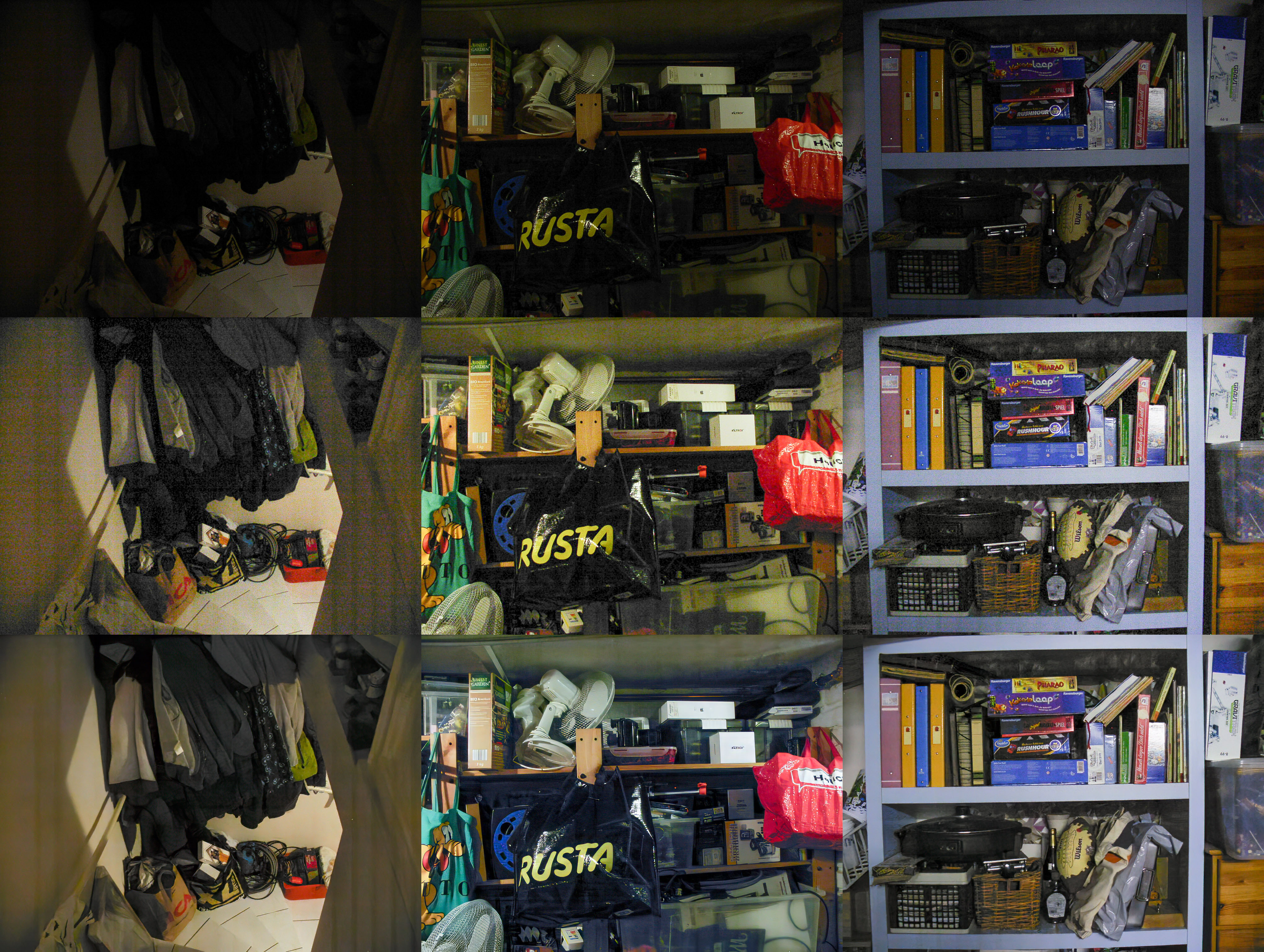 Die oberste Reihe des Neuner-Blocks zeigt die Originalfotos aus der E-100RS. Darunter in Reihe zwei die Aufhellung um plus 2,5 bis 2 EV mit Anhebung der Tiefen. Es rauscht, wie's Böse … Die dritte Reihe zeigt dann die jeweilige Entrauschung durch Topaz Photo AI. Das kann man brauchen. Und einen Riesenvorteil hat die Basketballhalle. Sie hat hervorragendes (vorgeschriebenes) Fernsehlicht. Ungleich besser als der schummrige Neonröhrenkeller. Das müsste also funktionieren.