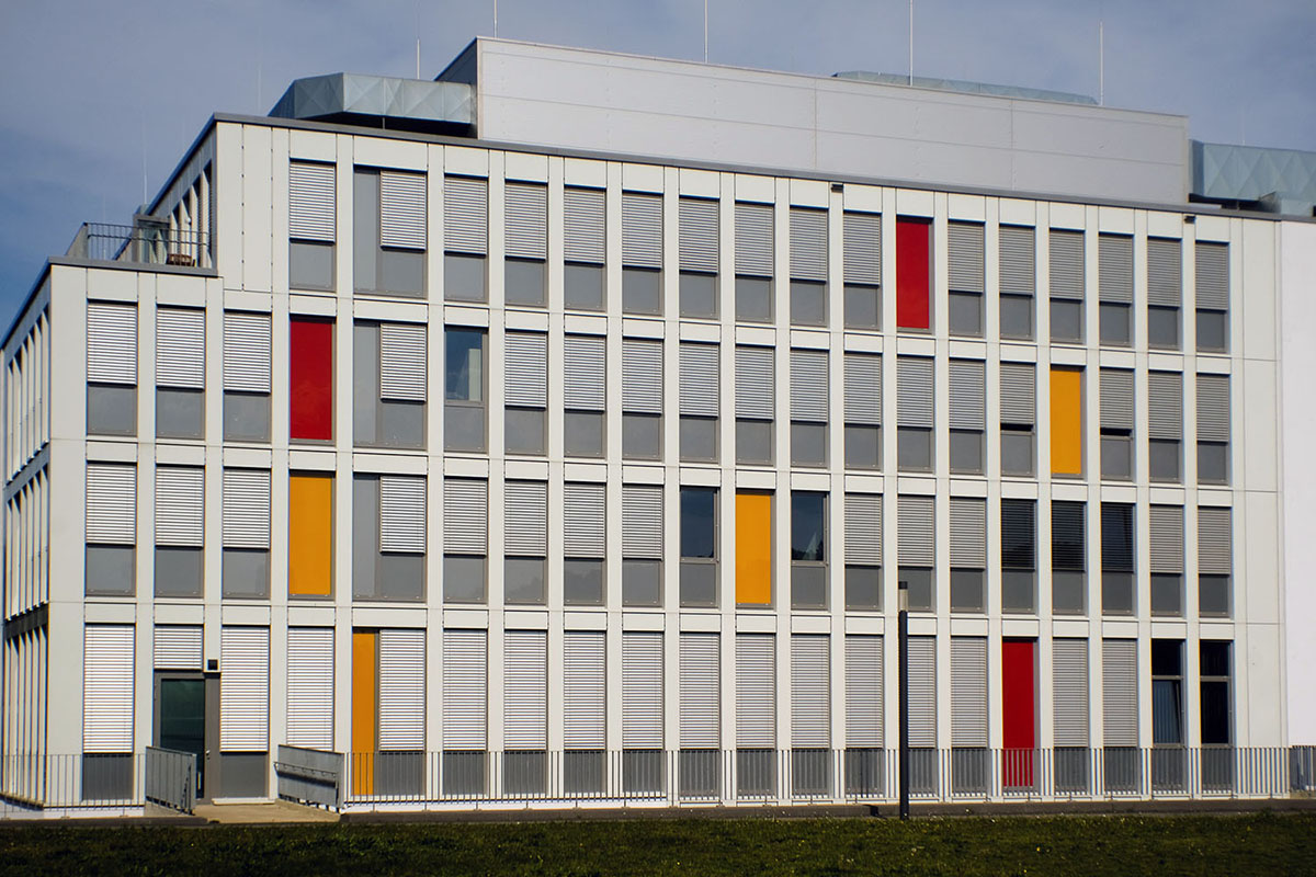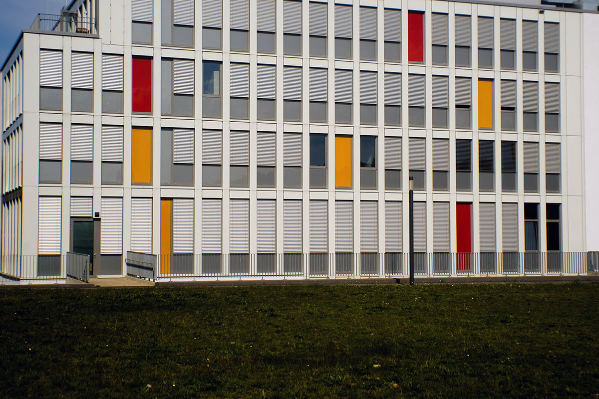 Deutlich besser die Lösung mit gemäßigterer Brennweite. Dazu wurde das Gebäude vom gleichen Standpunkt nach dem 10,5 mm Fisheye-Nikkor mit dem 4/20 mm MF Nikkor abgelichtet, was natürlich viel weniger Gebäude aufs Foto bringt.