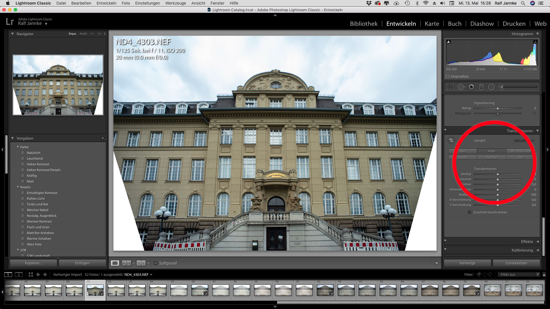 Ganz abgesehen davon, mit 35 mm Shift-Brennweite komme ich nicht weit, wenn ganze Gebäude erfasst werden müssen. Wer sich trotz der Softwaremöglichkeiten an einem richtigen Shiftobjektiv versuchen möchte, sollte zum weitwinkligeren 4/28 mm (1975) oder 3,5/28 mm PC Nikkor (1980) greifen, was mit viel Geduld und noch mehr Glück aber eine Investition von 300 Euro bedeutet.