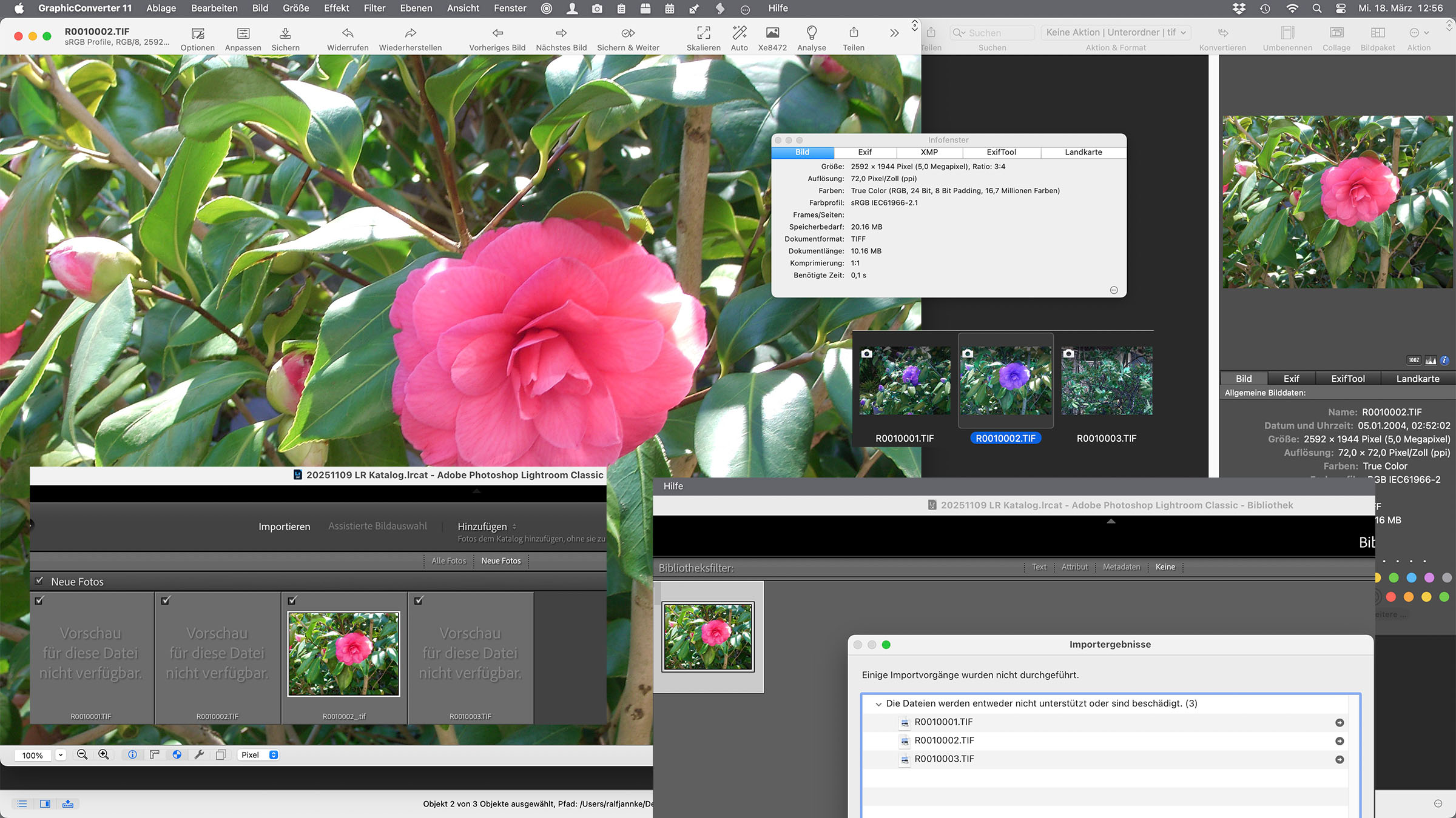 Es geht nur über den Umweg mit dem GraphicConverter, der statt roten zunächst blaue Kamelien zeigt, beim Öffnen dann aber die richtige Farbe: Rot. Die dann gespeicherte TIFF wird von Lightroom/Photoshop dann sofort gelesen!