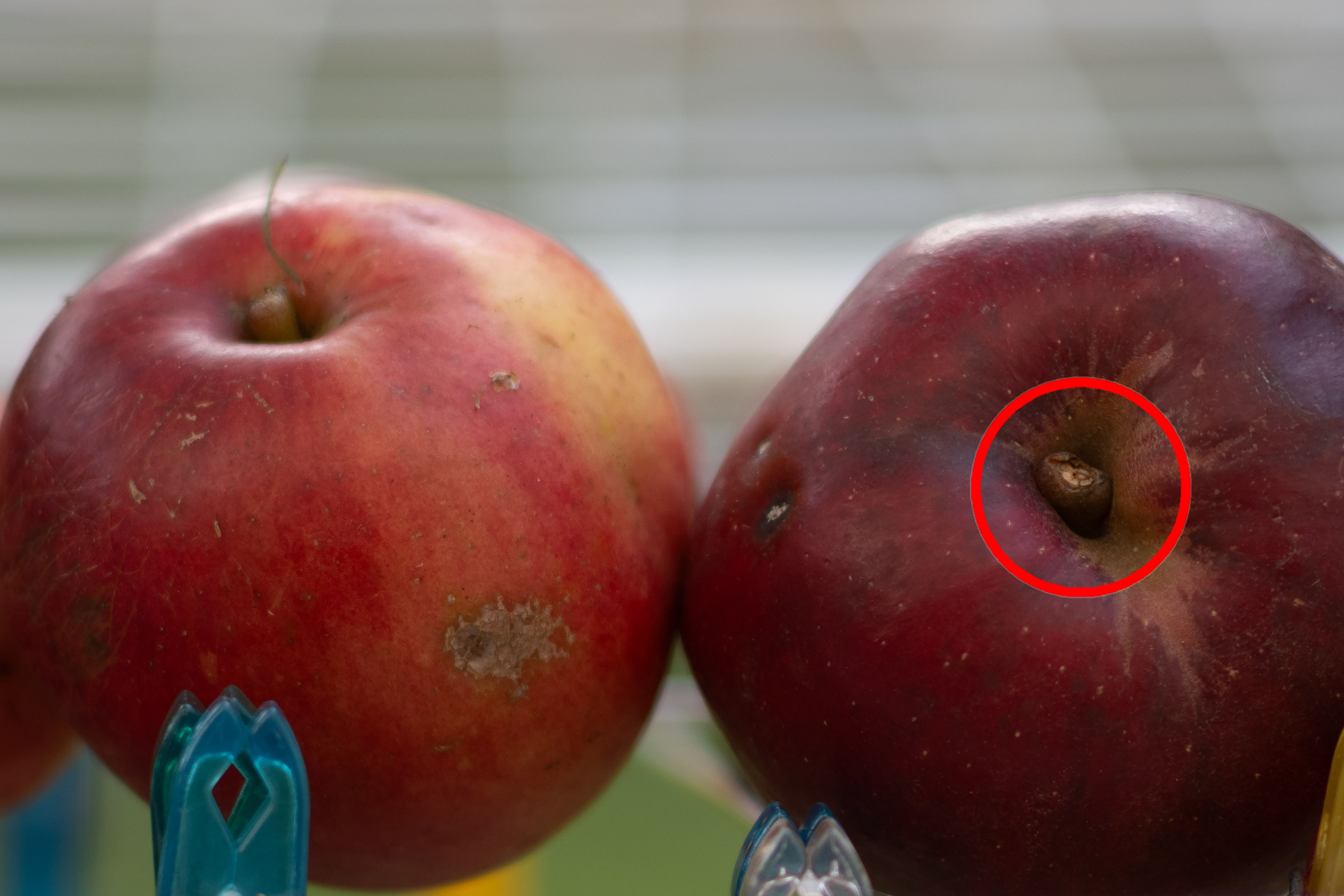 Erste Reihe die kompletten Fotos, reduziert auf 2.400 Pixel Breite. Zweite Reihe 1:1 Crops aus den 45 Megapixel der Nikon Z7. Man beachte die geringe Schärfentiefe am jeweiligen Apfelstiel! Entweder oder. Bei Offenblende ist das nicht zusammenzubringen …