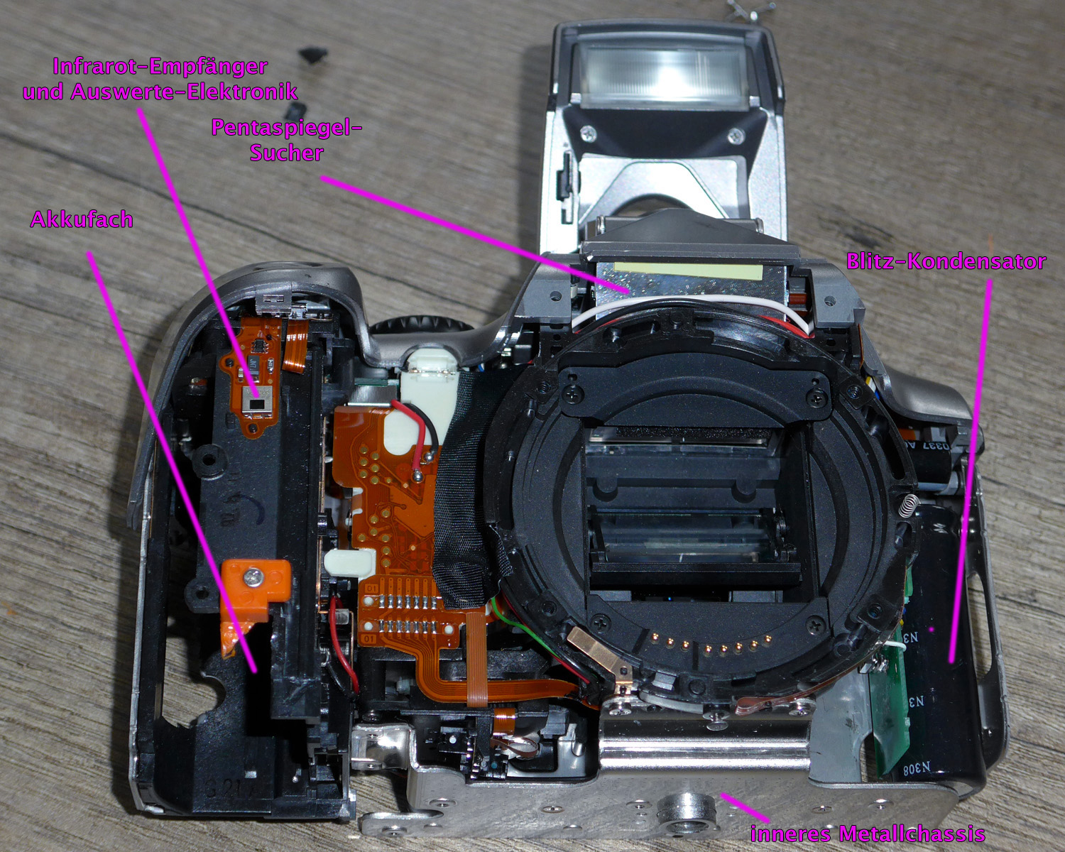 Die Einzelteile der Kamera machen deutlich, wie kompliziert eine Spiegelreflexkamera aufgebaut ist, weil sowohl mechanischer Verschluss, Spiegelkasten mit Antrieb, Pentaspiegelsucher, Akku, Blitzgerät und Blitzkondensator im Inneren untergebracht und miteinander verbunden werden müssen.
