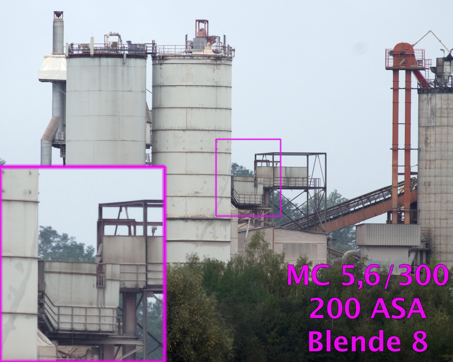 Das Objektiv erzielt bei Blende 8 keine wirklich guten Ergebnisse. In den Beispielaufnahmen macht sich bereits am Testtag in der Luft vorhandener leichter Dunst störend bemerkbar, außerdem sorgt auch die fehlende Stativschelle trotz elektrischem Fernauslöser zu Schwingungen durch den Verschluss. Ich werde es vermutlich nicht mehr einsetzen, zumal es an der Fuji APS-C-Kamera (mit 450mm äquivalenter Brennweite) dringend einen IBIS (In-Body-Image-Stabilizer) erfordert, den die X-E2 nicht hat.