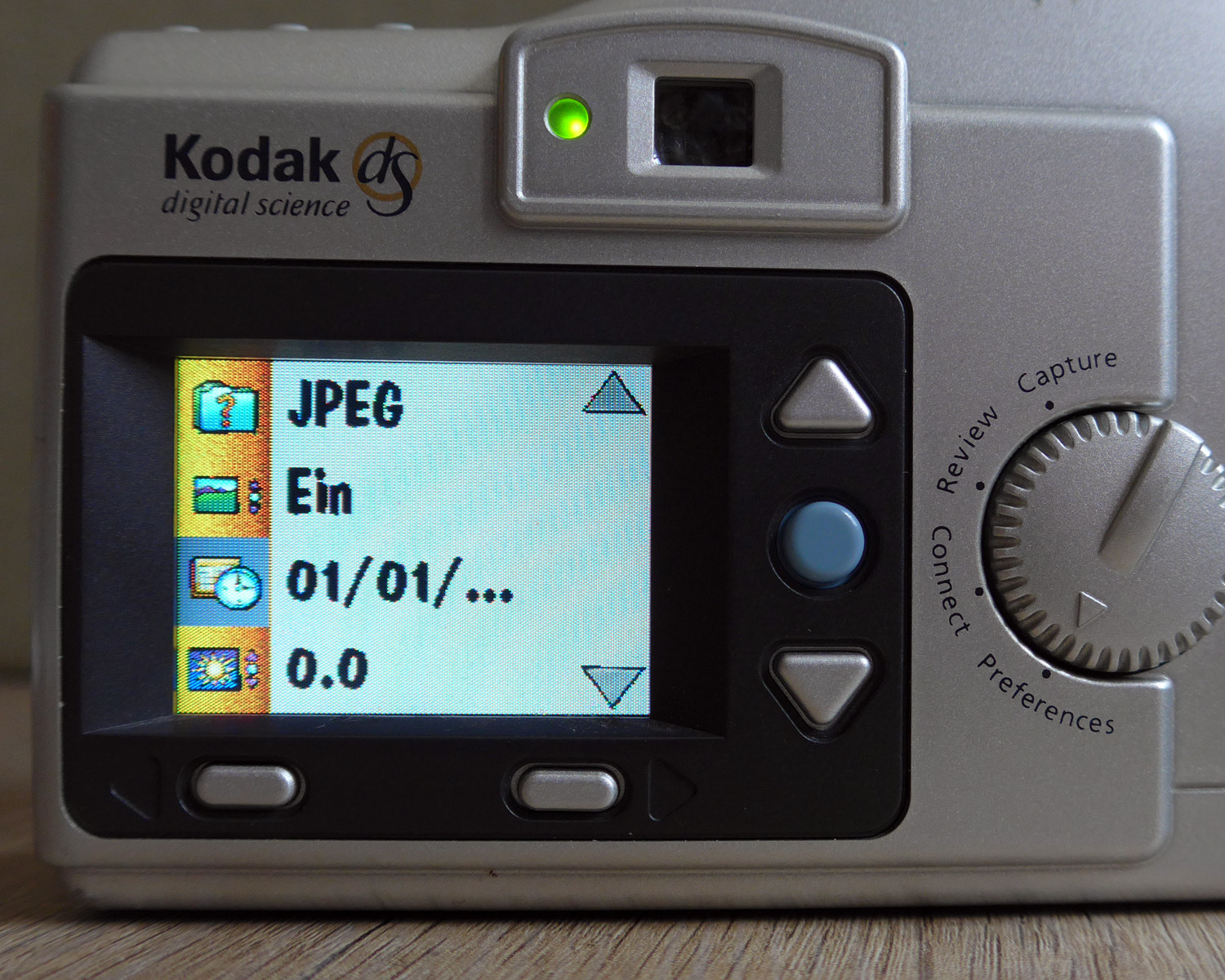 - Nach dem Einschalten „bootet“ der Kameraprozessor mehrere Sekunden, solange passiert erstmal gar nichts, man denkt schon, die DC210 ist defekt. Aber nach etlichen Sekunden leuchtet dann doch die Status-LED neben dem Sucher bzw. das Farbdisplay zeigt das Menu an.
