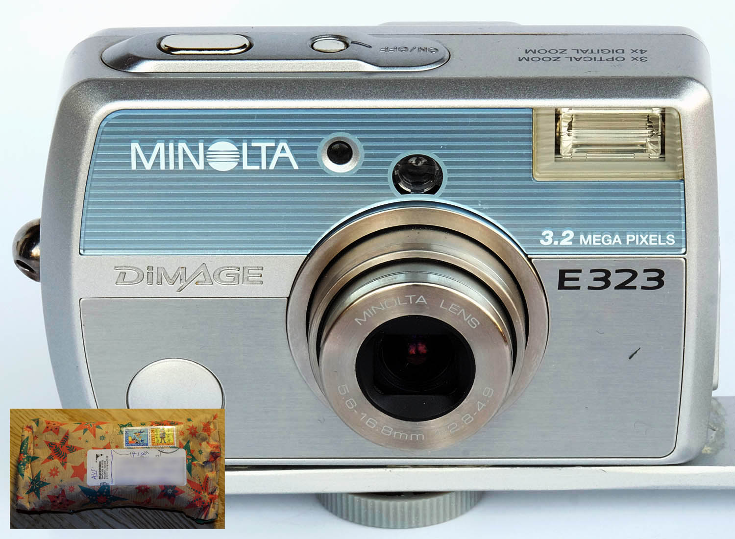 Eine 3 Megapixel Minolta Dimage E323 von 2003, die mit ihrem hellblau gehaltenen Oberteil wenigstens ein bisschen aus der Masse der beliebigen Konsumerkameras herausfällt. Bis auf den fast schon obligatorischen Bruch der Häkchen, die den Deckel des Batteriefachs zuhalten sollen, einwandfrei funktionierend. Die simple Bodenplatte, eingeschraubt ins Stativgewinde der E323 hält den Batteriedeckel zu. Praxisbericht der Minolta in 2019.