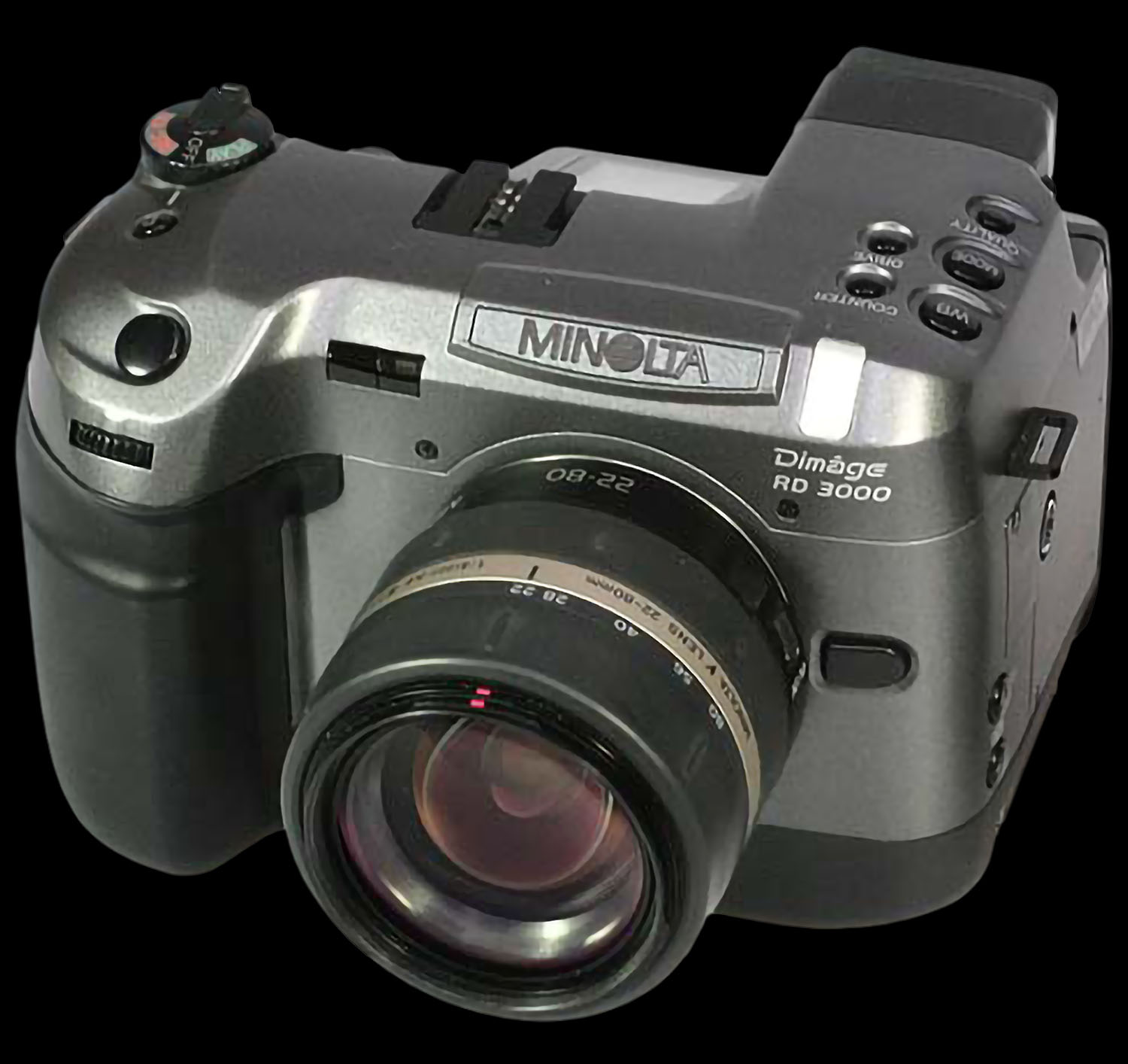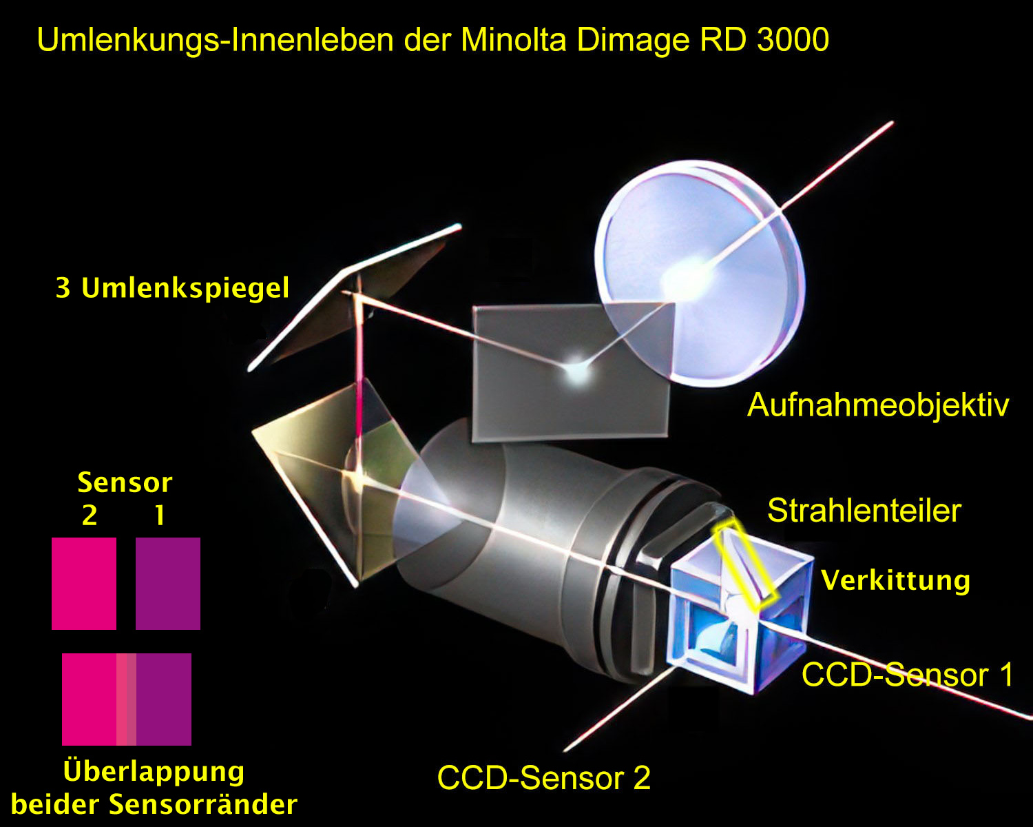 Die RD 3000 basiert auf der analogen APS-Kamera Vectis S1, und um ihr digitale Bilder zu entlocken, wandten die Minolta-Konstrukteure einen Trick an, der die Kamera klobig und unhandlich macht. Meist wird die Kamera leicht seitlich von oben abgebildet, damit der „Hunchback“, der gewaltige hinten angeflanschte Buckel nicht sofort ins Auge sticht. In diesem sitzt eine Relaisoptik, die das vom Objektiv eingefangene Licht auf zwei CCD-Sensoren leitet, die erheblich kleiner als das APS-Bild sind. Zum Entwicklungsstart gab es halbwegs bezahlbare Bildsensoren lediglich mit kleiner nutzbarer Fläche, größere waren sehr teuer, Minolta entschied sich für 1/2“-Sensoren mit 6,4x4,8mm Größe und 1,5 Megapixeln. Allerdings war klar, daß diese Auflösung zum Marktstart zu gering sein würde, deshalb wurden zwei Sensoren verbaut, von denen einer die linke und der andere die rechte Bildhälfte erfaßt. Die beiden Halbbilder werden dann vom Prozessor zu einem einzigem Bild zusammengerechnet, wobei die Bildmitte etwas überlappt, so daß effektiv 2,7 Megapixel genutzt werden.