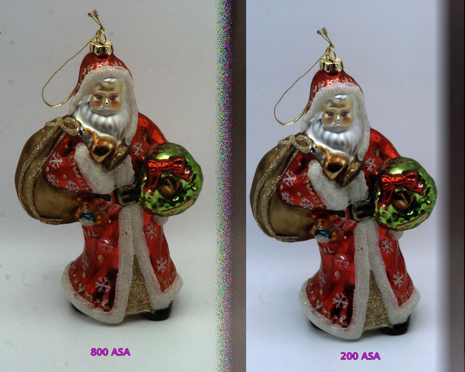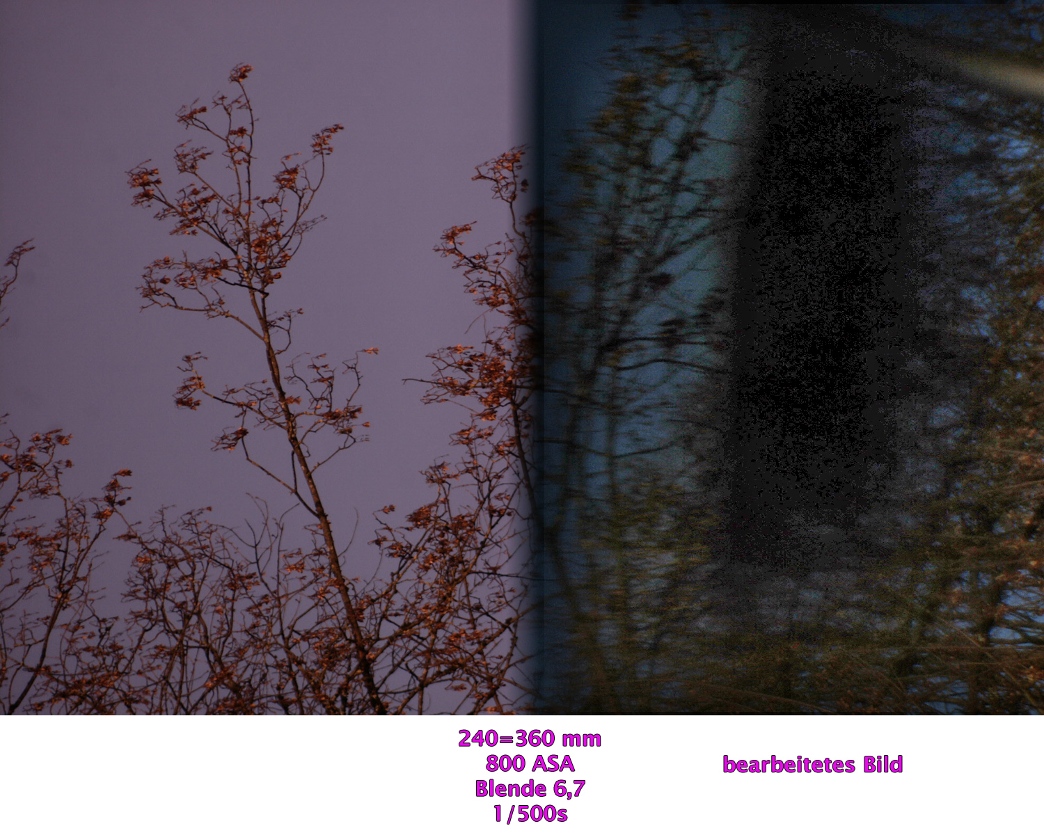 Letztlich resultiert die Relaisoptik in einer verringerten Blendenzahl der Objektive, eine größere Öffnung als 1:6,7 ist nicht möglich, selbst das recht lichtstarke 3,5 / 50 mm - Makro mutiert zu einem Objektiv mit Offenblende 1:6,7. Um das etwas auszugleichen, haben beide Sensoren 200 ASA Grundempfindlichkeit und die erhöhte Empfindlichkeit beträgt 800 ASA (mit starkem Bildrauschen).
